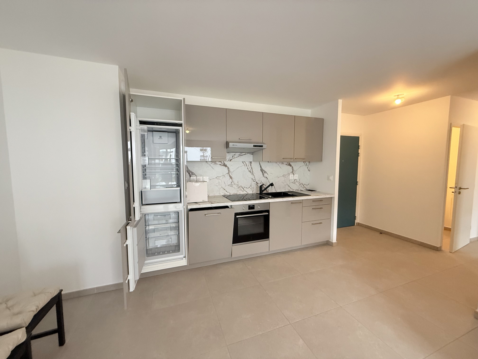 D’une vaste entrée avec placard, d’une cuisine entièrement équipée ouverte sur un séjour salon salle à manger donnant directement accès à la terrasse et au jardin exposé plein sud.