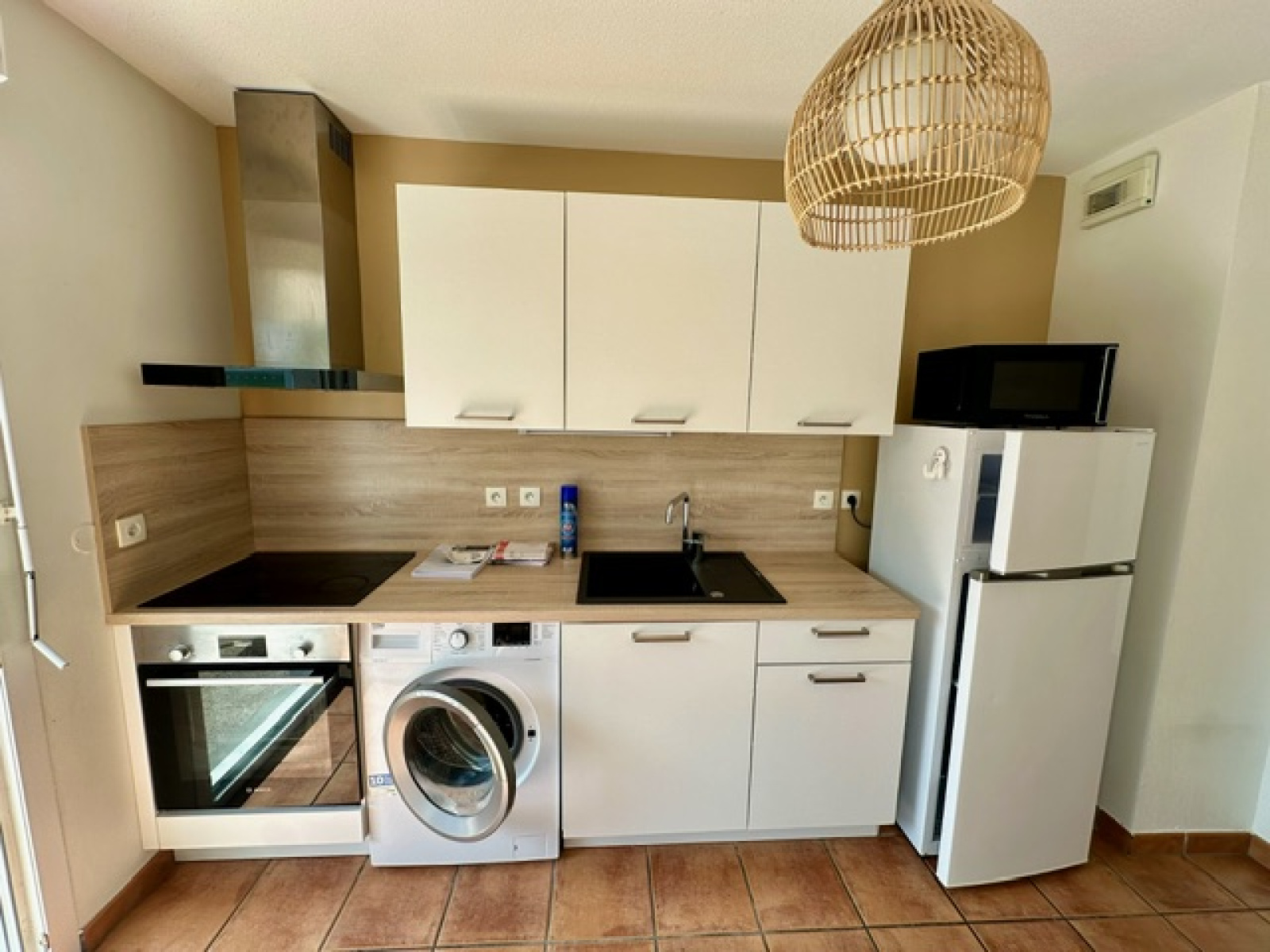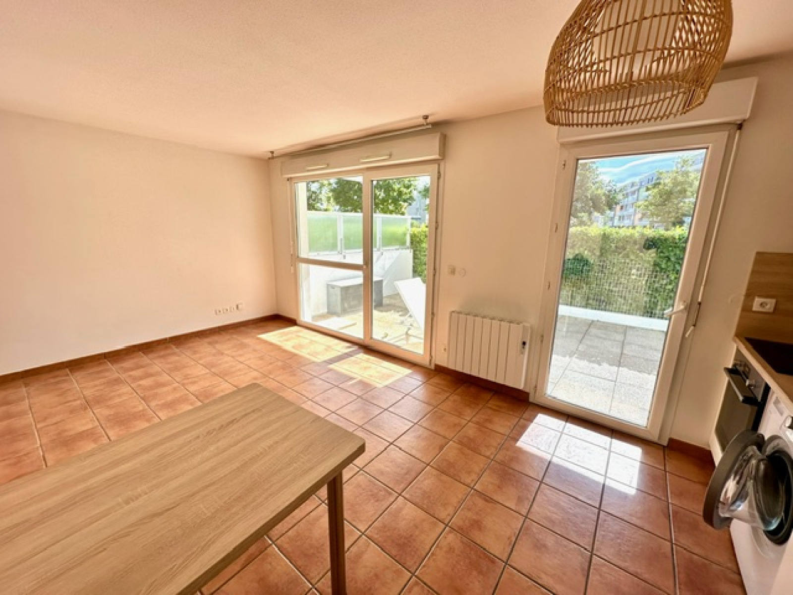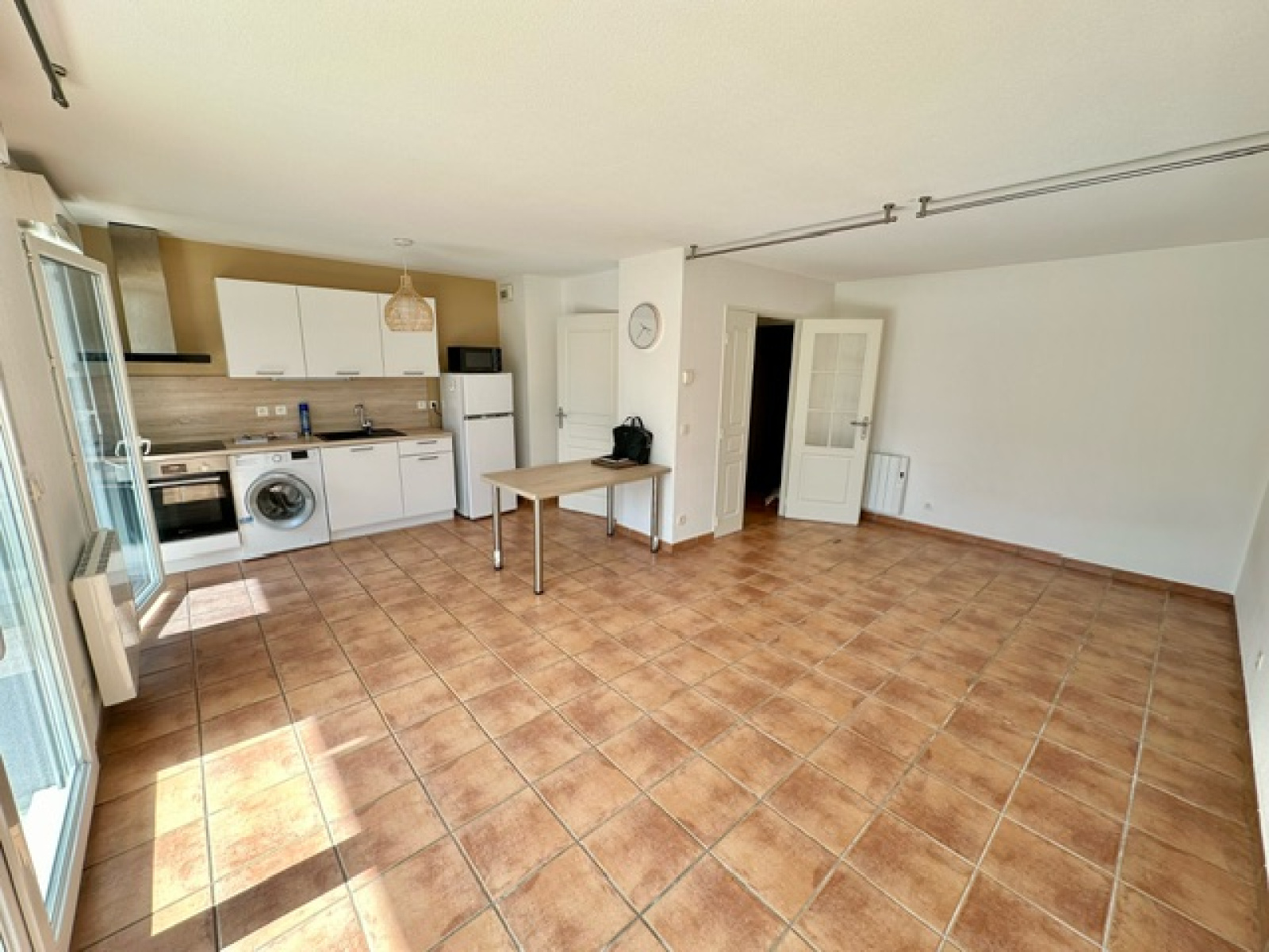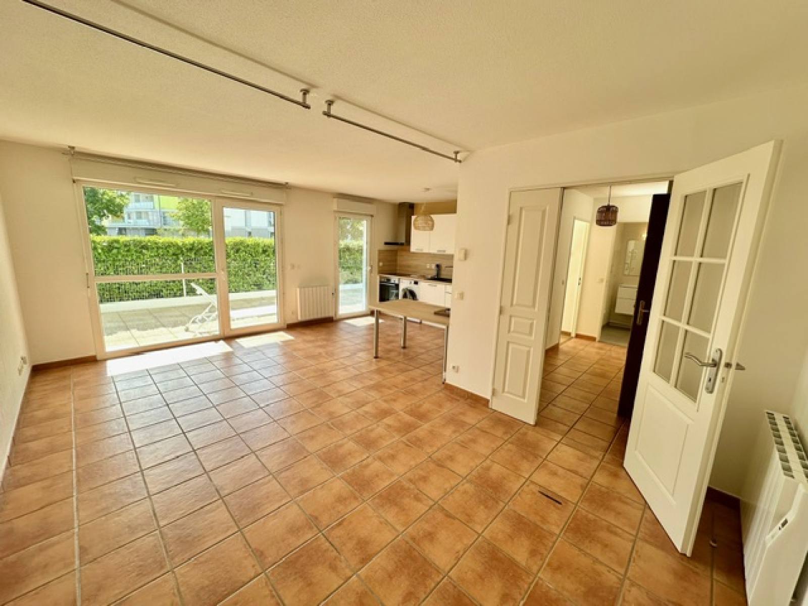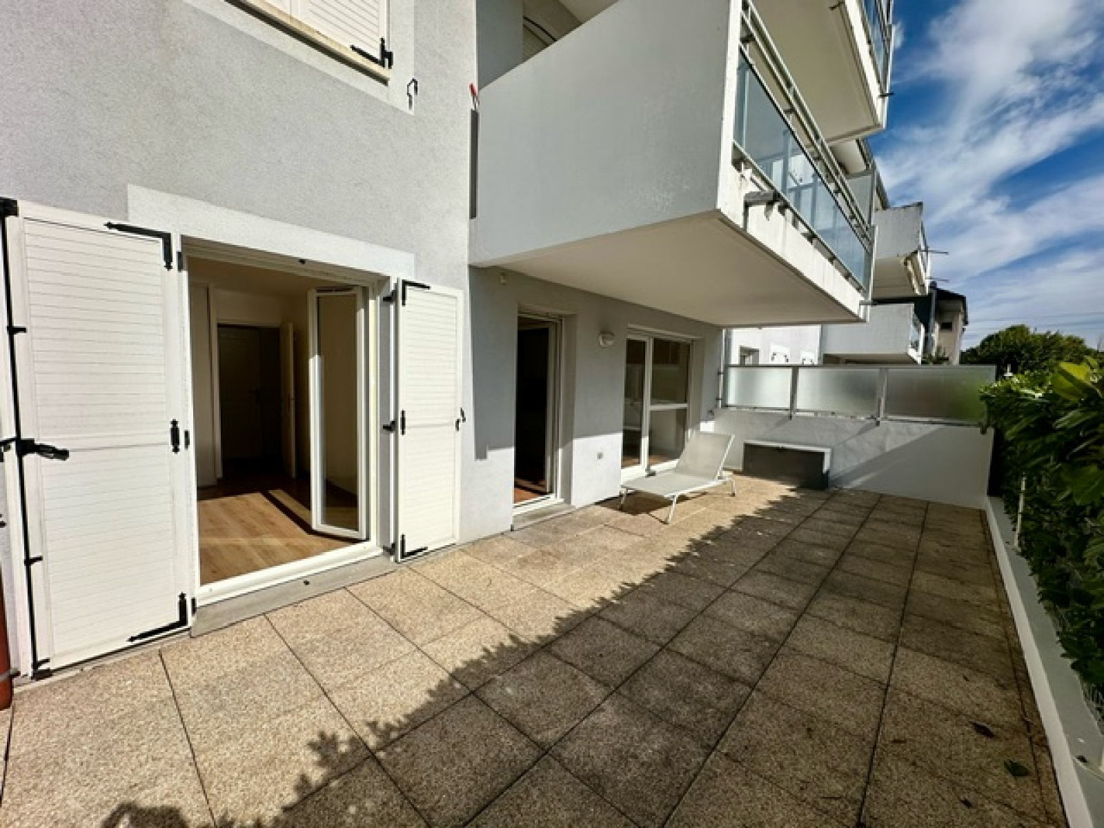Saint Genis Pouilly 01630, à louer T2 de 49m2 habitables situé en rez avec une terrasse privée de 30² exposée sud-ouest. L'appartement est composé : d'une entrée avec placard, une cuisine équipée ouverte sur le salon-séjour avec accès à la terrasse, un dégagement, une chambre avec placards, une salle d'eau et wc séparé. En annexe au sous-sol : une cave et une place de parking privative.