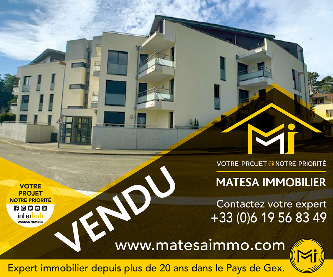 Appartement T3 / T4 de 79m² à GEX 01170 (quartier les vertes campagnes) avec magnifique vue sur les Alpes et le Jura, exposé sud est ouest, très lumineux, au DERNIER ETAGE (6/6), avec une cave et un parking privé extérieur. Il est proche des écoles, du bus F et des commerces. L'appartement comprend : un hall d'entrée avec placard, un wc séparé, une cuisine séparée meublée, un double salon-séjour-salle à manger, 2 chambres avec placards inclus (mais possibilité une 3ième chambre), 1 salle de bain avec baignoire et fenêtre. En annexe : 1 cave et 1 place de parking extérieure. Chauffage au gaz. Prix attractif ! MATESA IMMOBILIER, agence immobilière spécialisée du Pays de Gex, Vente et achat T3-T4 Gex 01170