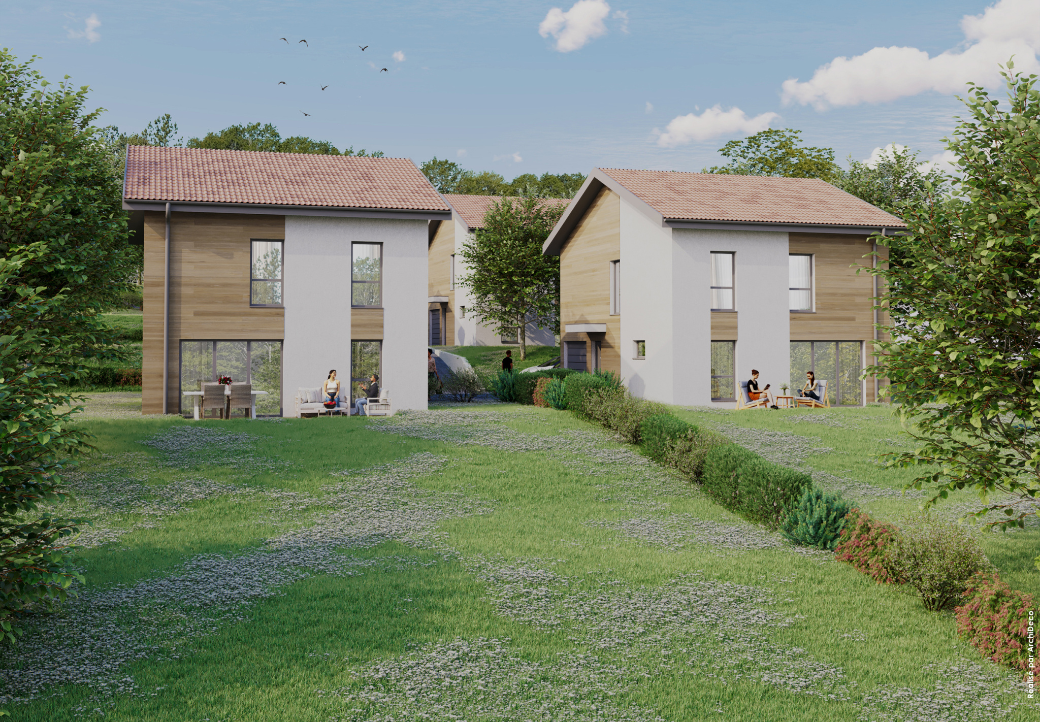 Prestations de qualités : construction ossature bois, pompe à chaleur avec chauffage au sol au rez, carrelage 60X60 , faïences et parquet inclus et au choix . Jardins engazonnés, etc.