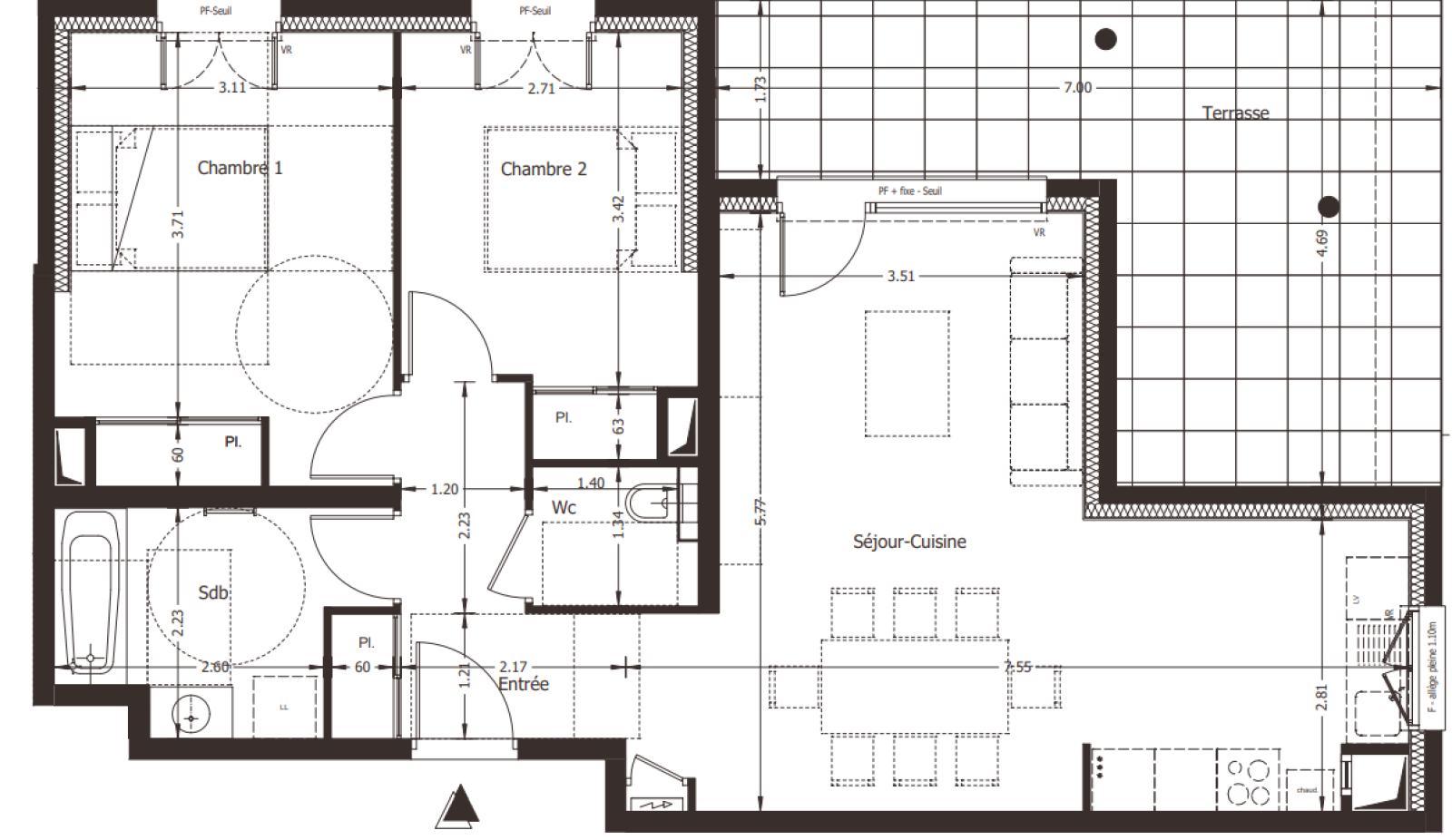 SEGNY 01170 - Appartement de type T3 de 67,64m2 avec terrasse de 21,31m2 et un jardin de 79,4m2. L'appartement est composé : d'une entrée avec placard, une cuisine entièrement équipée et ouverte sur le salon salle à manger avec accès à la terrasse et au jardin, une salle de bain, un WC sépraré et deux chambres avec placards intégrés.