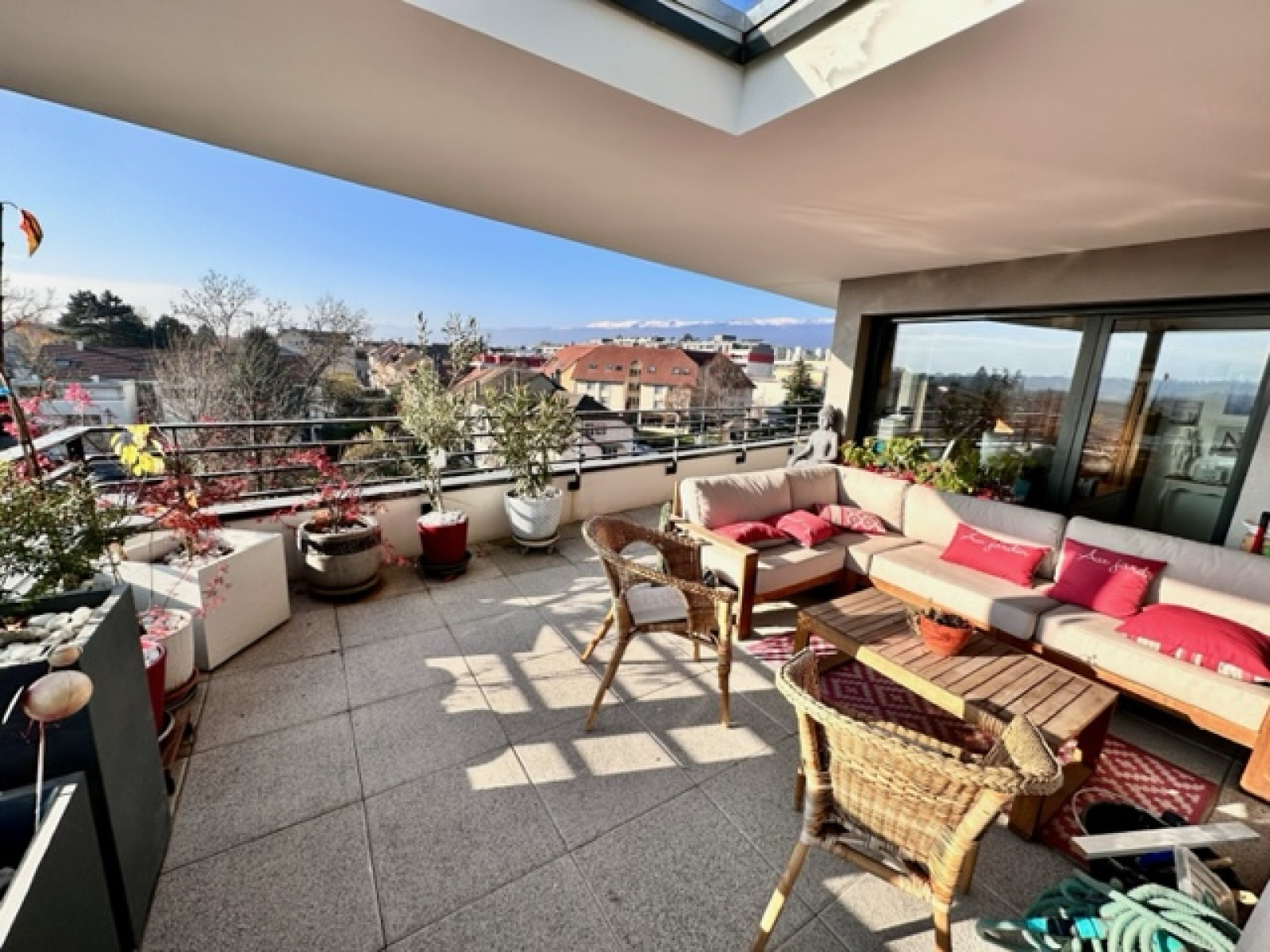 Ferney-Voltaire 01210, dans une résidence de standing de 2019 située au cœur de la ville, au dernier étage en attique, magnifique appartement type T5 de 122m² avec une terrasse unique de 73m² avec de très belles vues dégagées et aux finitions de grand standing, et composé : belle entrée, une cuisine entièrement équipée avec ilot central (de marque Schmidt), salle à manger et salon séjour, une suite parentale avec rangement sur mesure et sa salle de douche privative, un wc séparé avec lave-main, un dégagement desservant une buanderie-cellier, trois chambres, un autre wc séparé avec lave-main et une salle de bain complète. L’intégralité des pièces de l’appartement permettent l’accès à la terrasse exposée sud et ouest sans vis-à-vis et bénéficiant de très belles vues. L’appartement a été conçu et équipé par un architecte d’intérieur avec beaucoup de rangements sur mesure et de très belles finitions. Immeuble écologique basse consommation, très faibles charges de copropriété. Toutes les commodités à pied. Au sous-sol : un garage pour 2 voitures côte à côte (porte électrique) Matesa immobilier, agence immobilière spécialisée Pays de Gex depuis plus de 20 années. Vente et achat appartement Ferney-Voltaire 01210