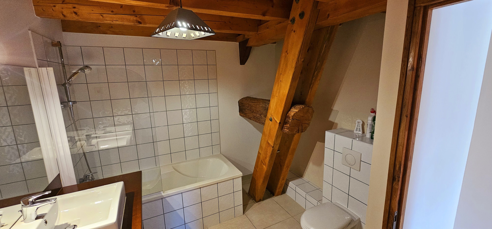 D’une magnifique et grande pièce de vie avec la cuisine entièrement équipée ouverte sur le salon-séjour avec plafond cathédrale et poutres apparentes, une chambre avec grand placard, une salle de bain avec toilettes.