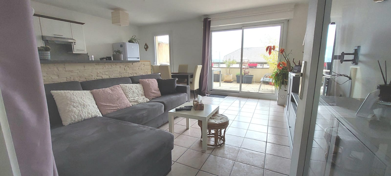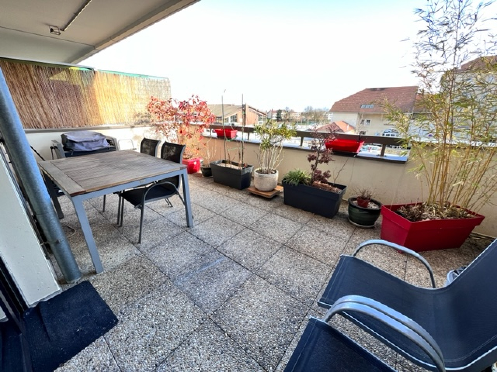 A VISITER RAPIDEMENT ! CESSY 01170, au centre du village, confortable appartement 2 pièces - T2 traversant de 57m² avec une magnifique terrasse de 18m² exposée au sud avec vue Alpes et Jura, et un balcon. Il est composé : d'une grande entrée avec un grand placard, une pièce de vie avec une cuisine entièrement équipée ouverte sur la salle à manger, le salon-séjour et donnant accès à la terrasse, un dégagement, un wc séparé, une salle de bain, et une chambre avec son balcon. Appartement en parfait état, idéal 1er achat ou investissement, très lumineux. Il dispose d'une cave et d'un garage fermé en sous-sol. Au pied de la résidence : commerces, BUS F pour Genève, écoles, pharmacie, médecin.