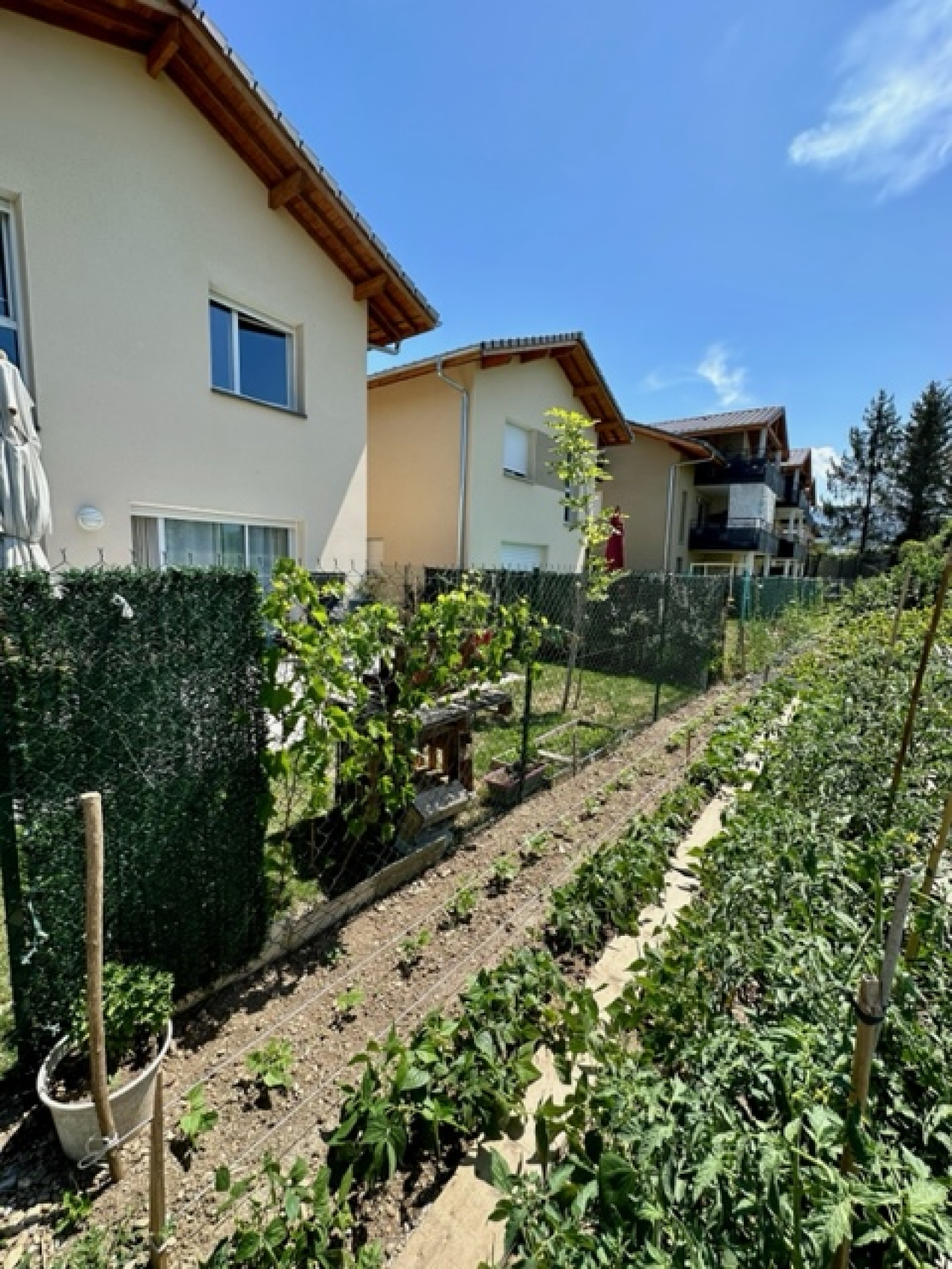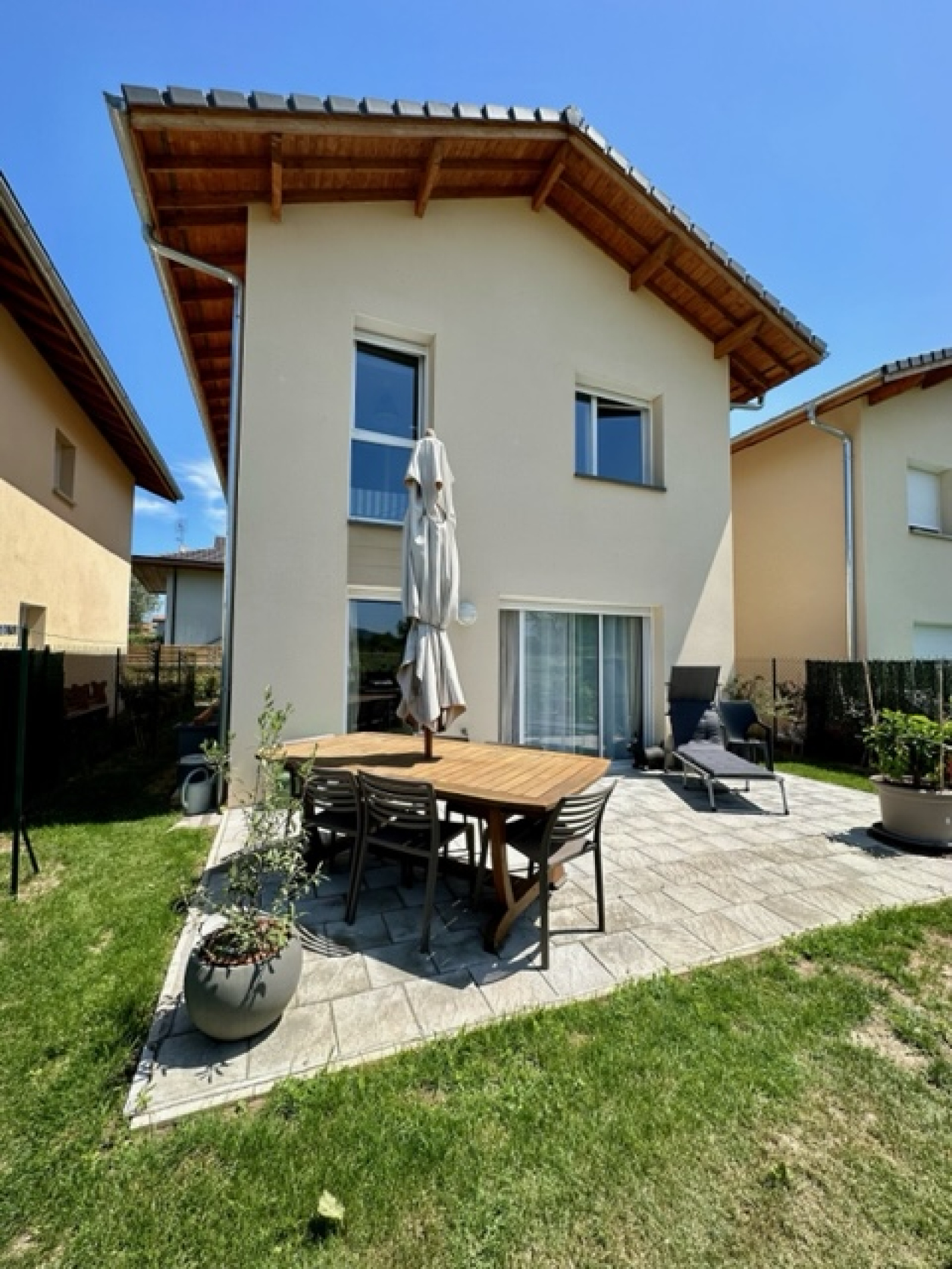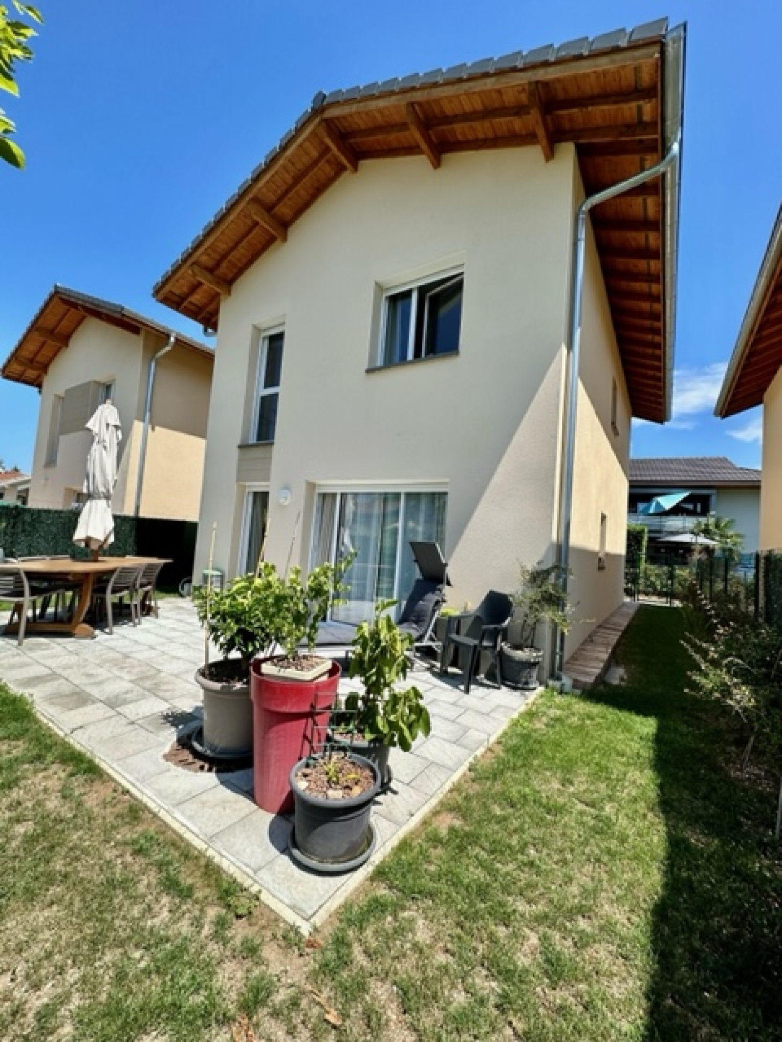 En exclusivité, située à Margencel direction port de Séchex, nous sommes ravis de vous proposer à la vente cette très jolie maison individuelle d’environ 90m2 habitables avec une terrasse et un jardin. Elle est en parfait état car livrée en 2020 et bénéficie des dernières normes énergétiques. Elle est située au calme au fond d’une impasse résidentielle. Elle se compose au rez-de-chaussée : une belle entrée avec une penderies et un grand rangement sous l’escalier, une lumineuse pièce de vie avec une cuisine de très bonne qualité entièrement équipée avec son îlot central, une salle à manger - salon - séjour le tout donnant accès à la terrasse et au jardin exposé sud et ouest, une salle douche équipée avec meuble vasque, un wc suspendu et une fenêtre. A l’étage : un dégagement desservant un wc séparé avec lave main, 3 chambres, une salle de bain avec meuble vasque et fenêtre. En annexe : un garage fermé avec une mezzanine, une place de parking privative extérieure. Chauffage gaz de ville individuel ainsi que des panneaux solaires pour auto-consommation. Construction récente et très bon classement énergétique.