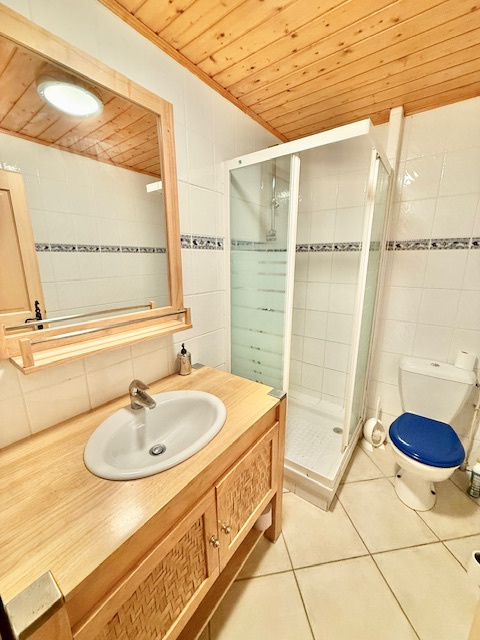 A l’étage 1 au rez-de-jardin : Un grand et vaste salon-séjour-salle à manger avec poêle à bois et un balcon exposé plein sud-ouest, une cuisine séparée entièrement équipée avec espace repas et son cellier attenant (possibilité de faire une buanderie). La cuisine donnant accès à la terrasse dallée avec le jardin. Nous trouvons aussi un wc séparé avec un lave-main et fenêtre, une chambre avec penderies, une salle de douche avec une fenêtre et double vasque.