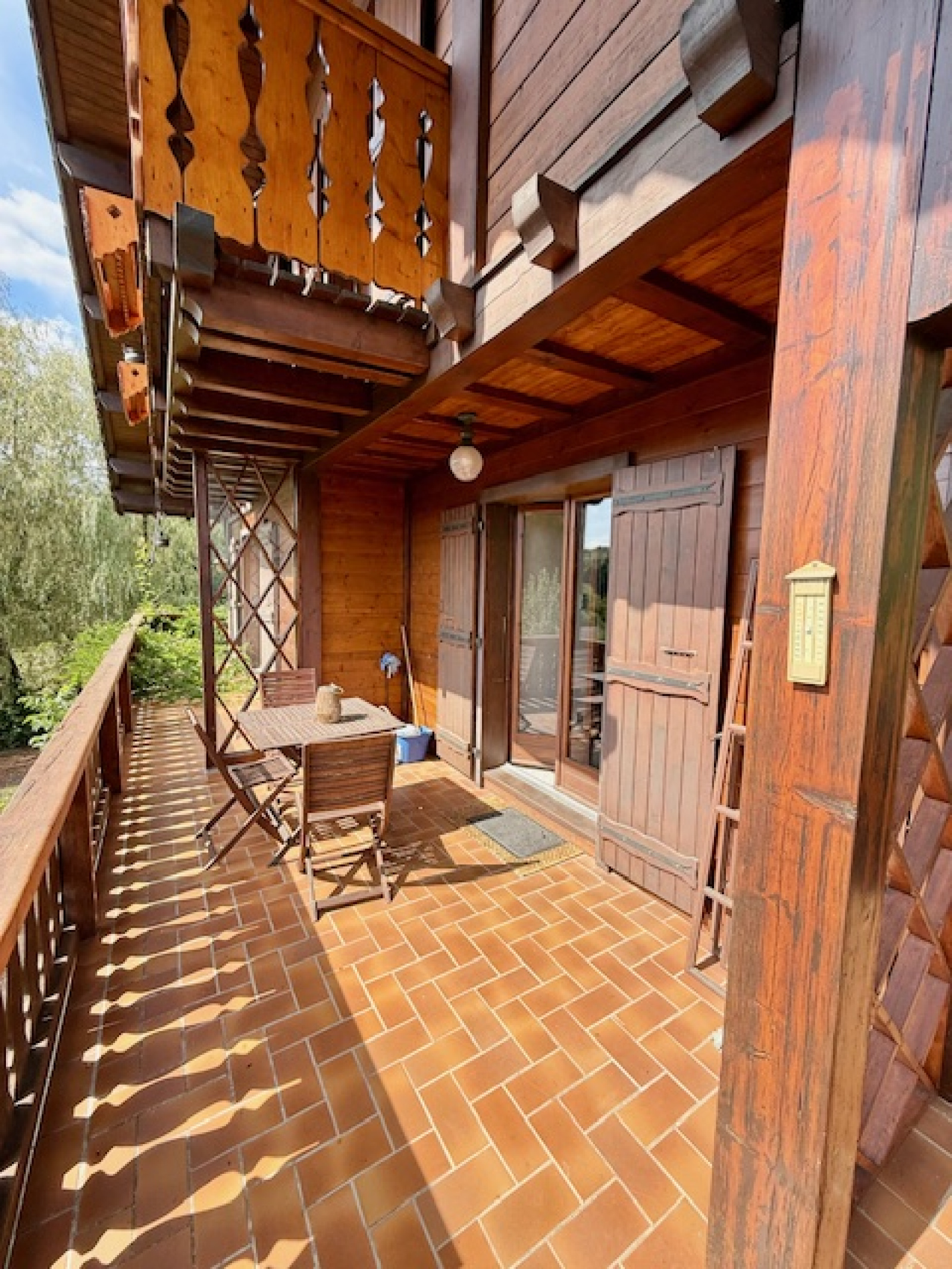 Le terrain, soigneusement entretenu, offre une atmosphère paisible et arborée avec de nombreuses terrasses pour profiter des beaux jours, un véritable chalet de jardin et un abri voiture.