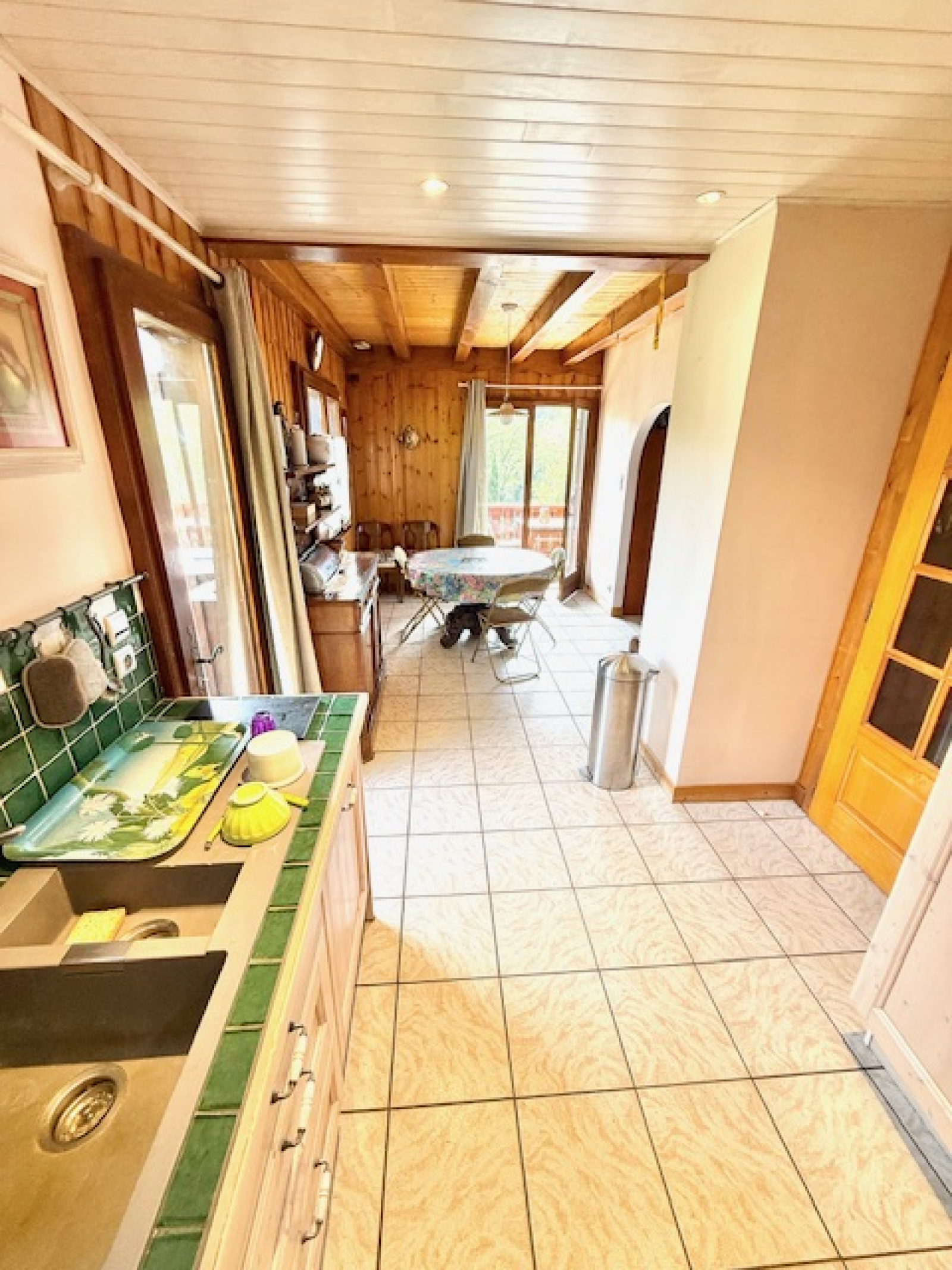 Cuisine aménagée avec espace repas avec accès au balcon et au jardin