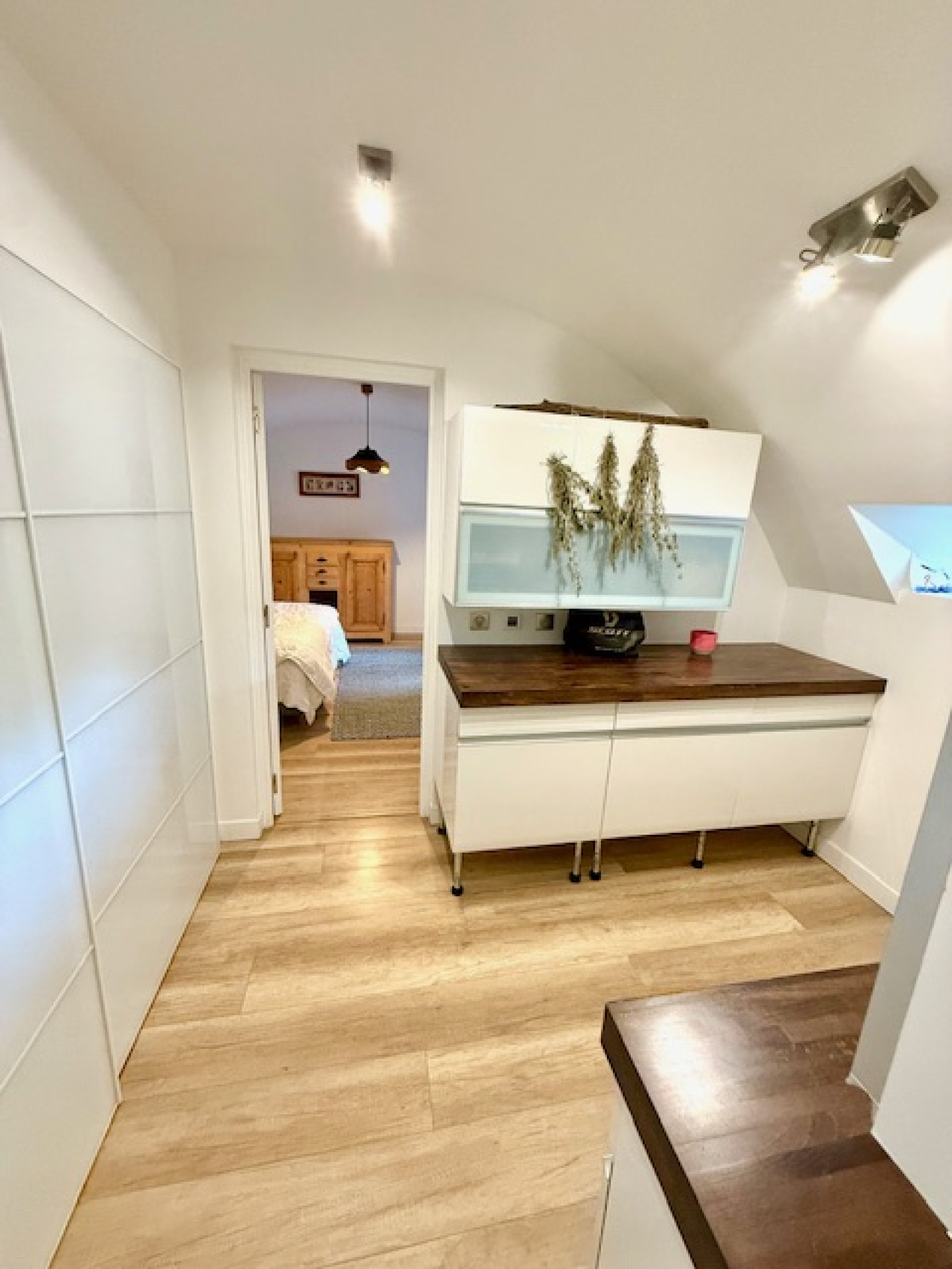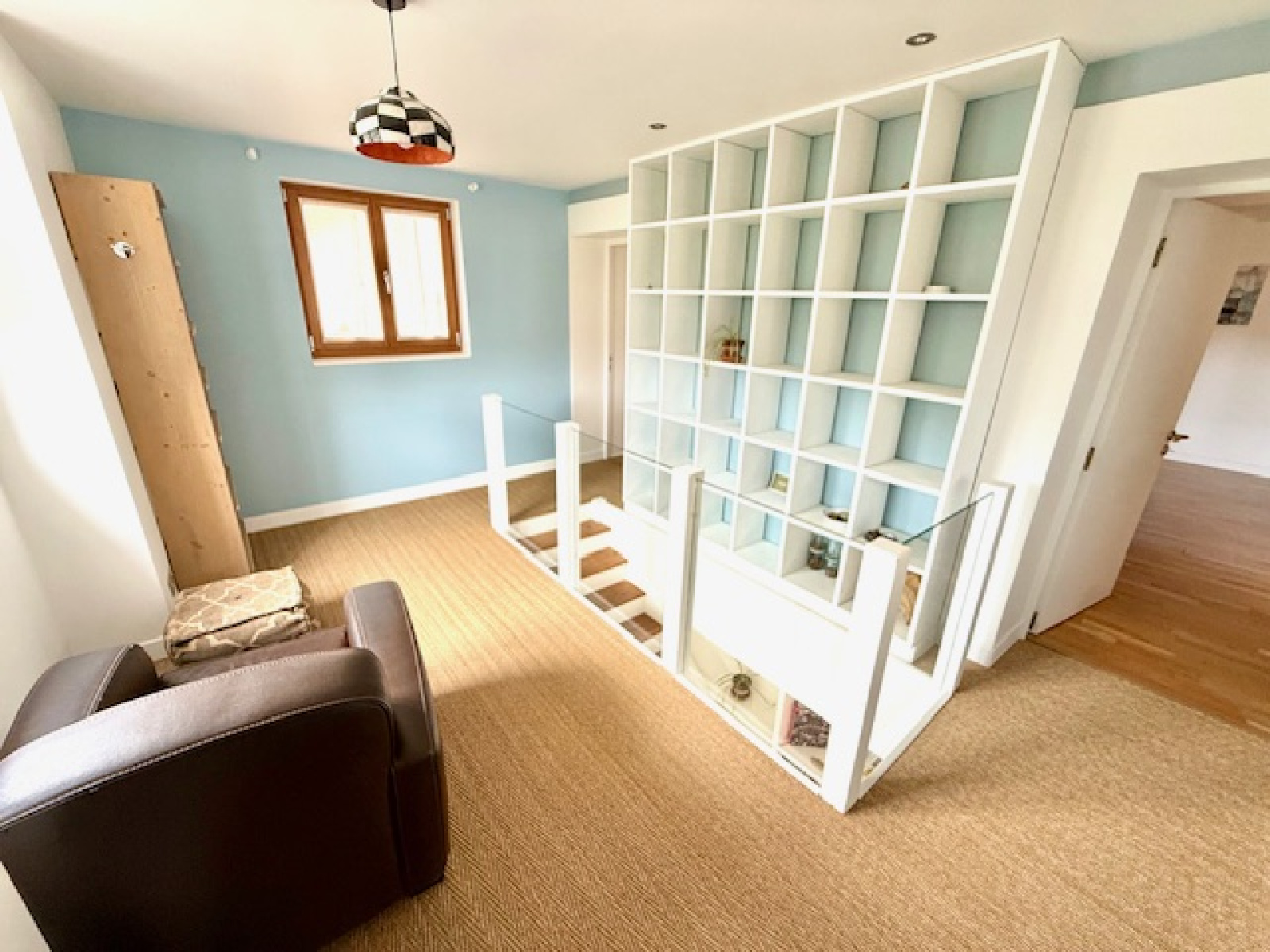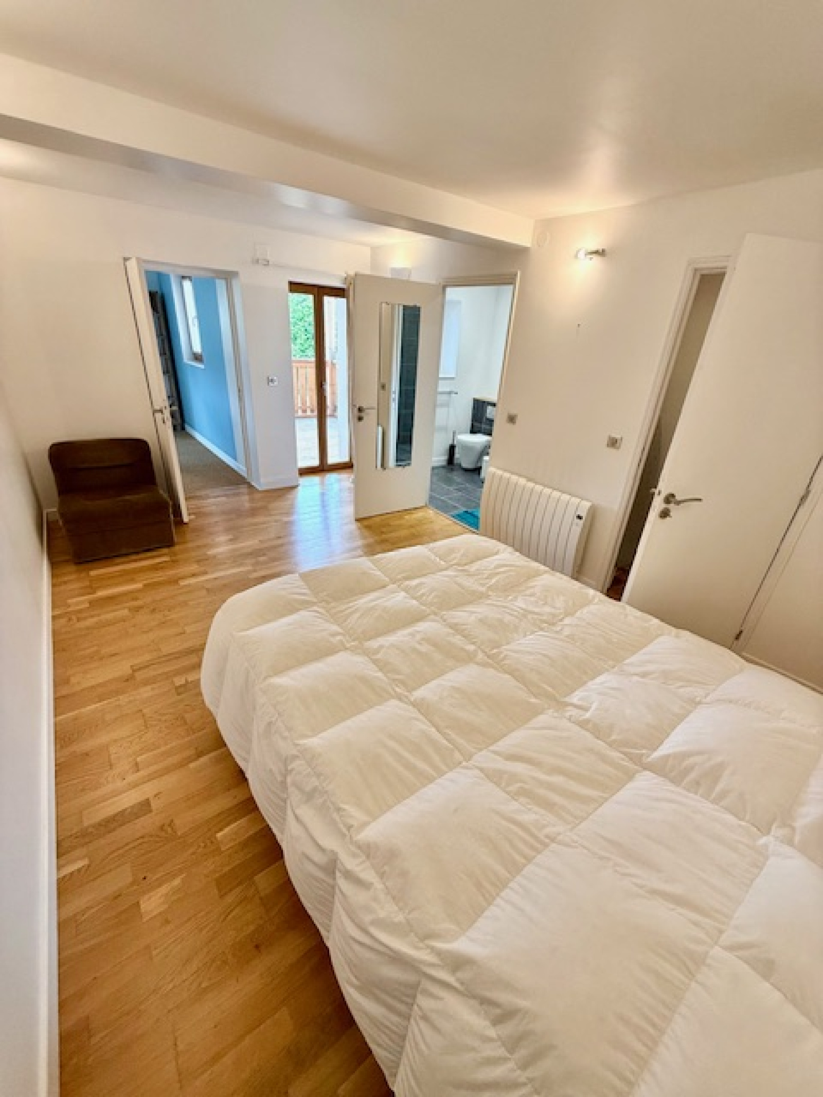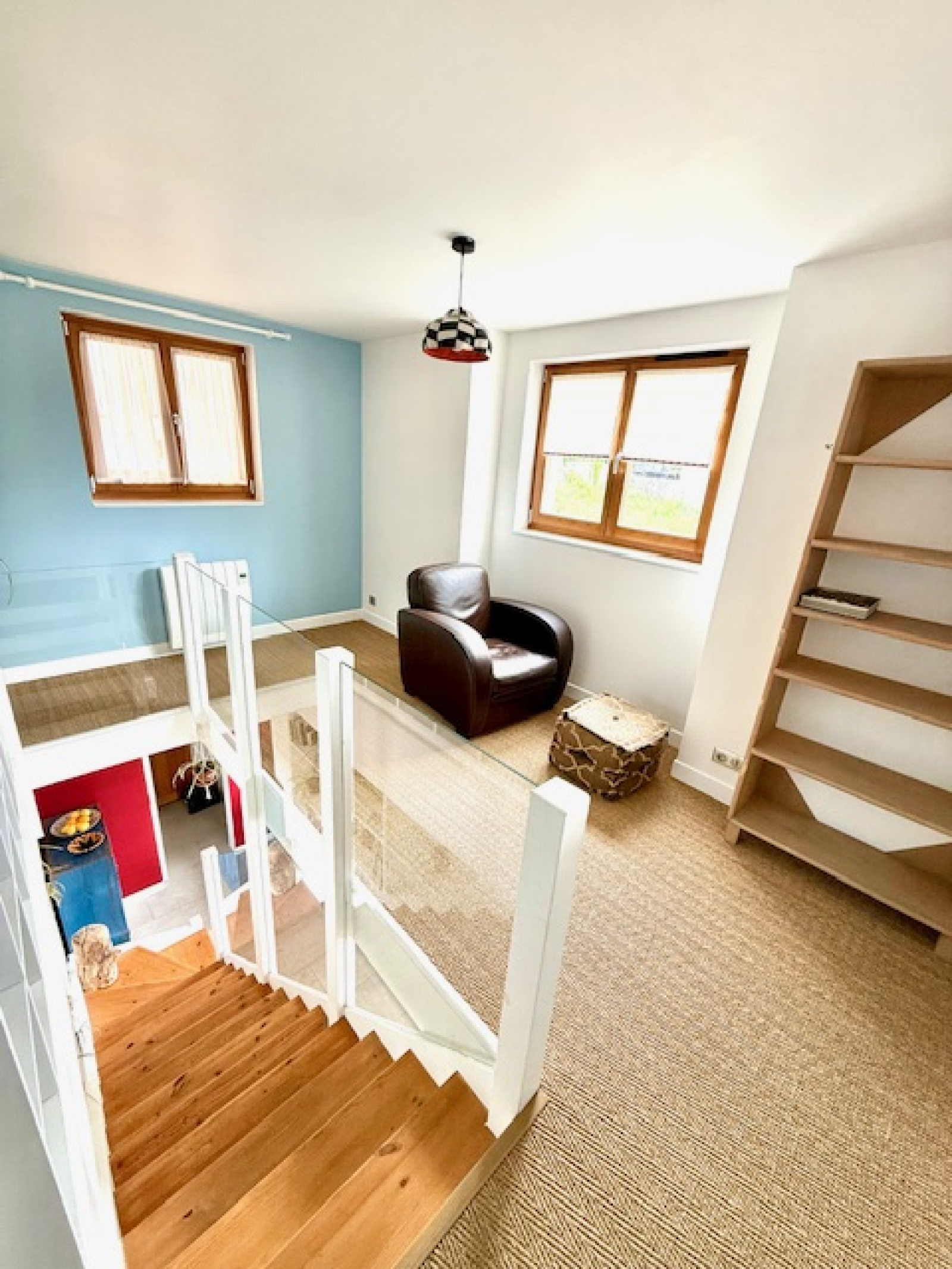 A l’étage : une mezzanine servant d’un espace bureau, deux très grandes suites dont une avec un dressing et avec leurs propres salles d’eau avec wc et balcons.