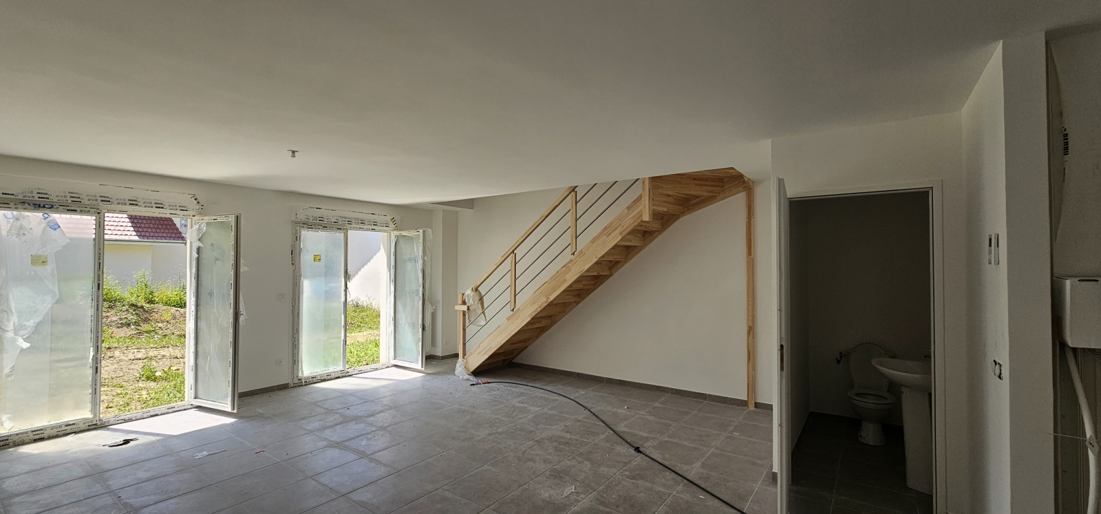 Elle se compose au RDC : d’une entrée avec cuisine ouverte sur le séjour salon donnant accès au jardin et un wc visiteur.