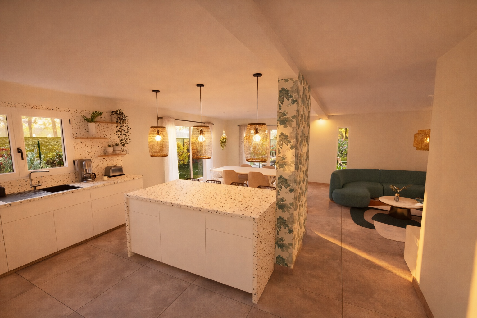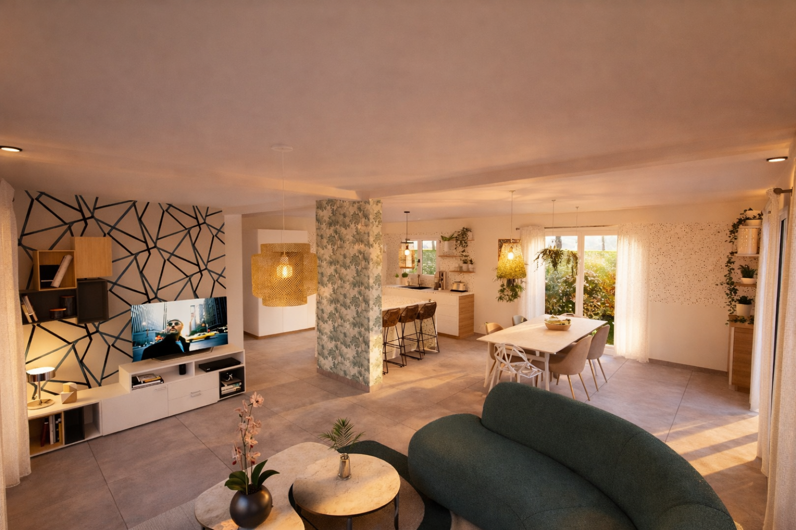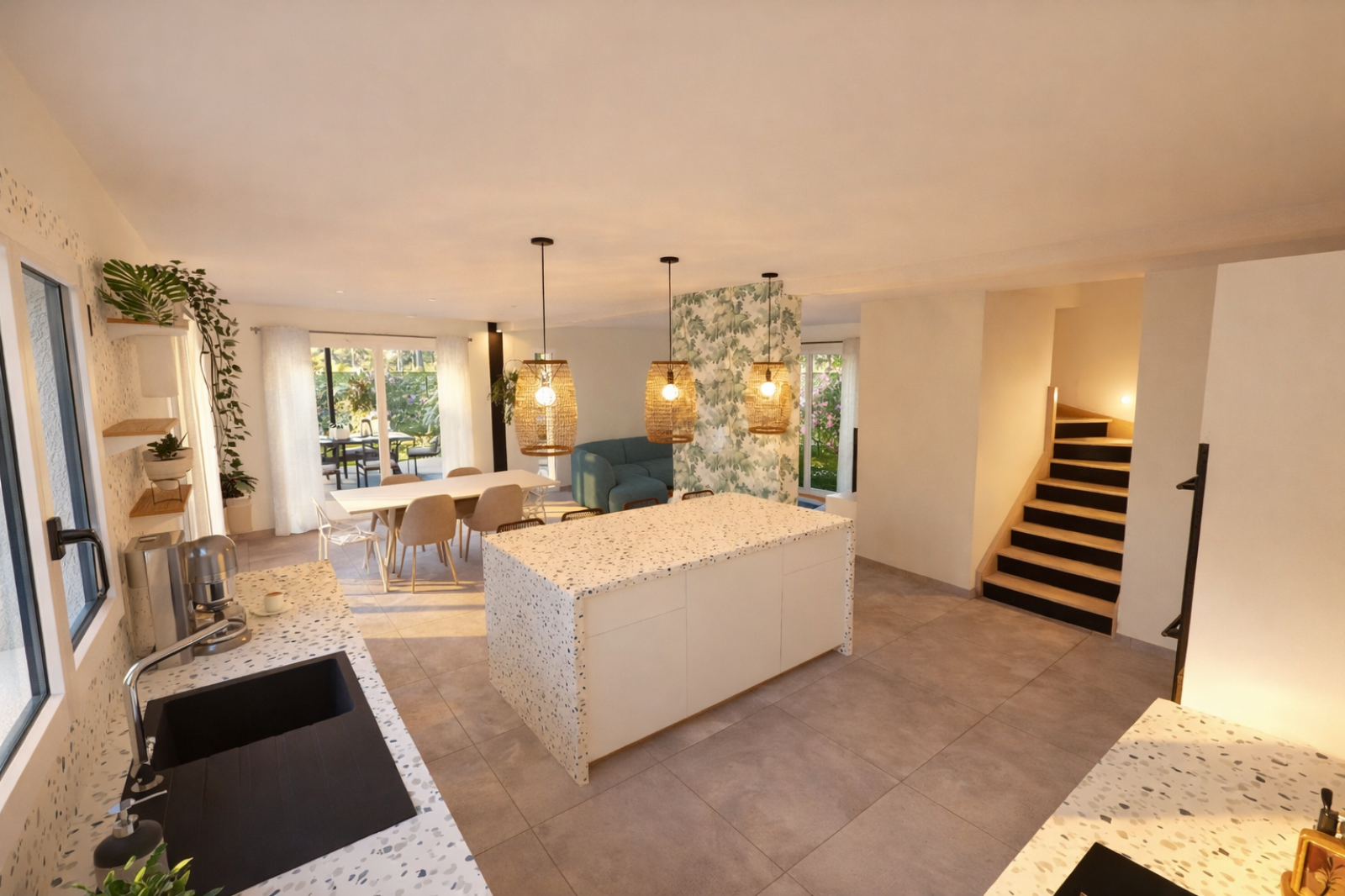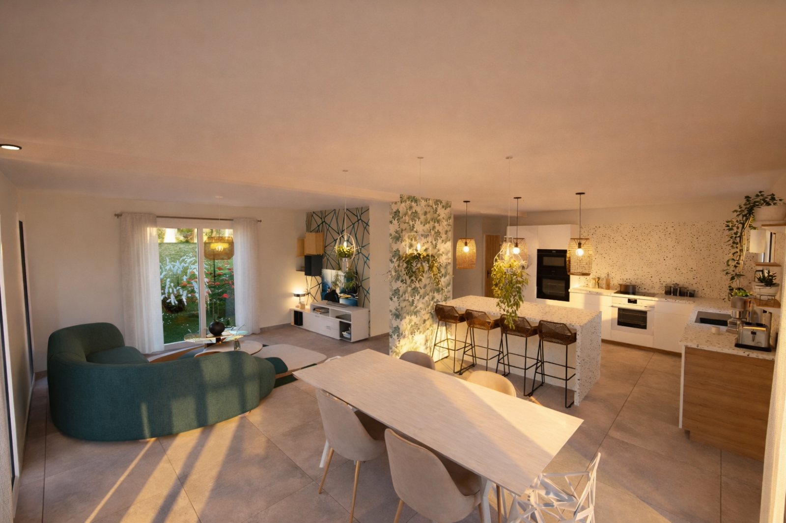 Une vaste et belle entrée avec un dressing, un wc visiteur suspendu avec lave-main et fenêtre, une pièce de vie avec cuisine et un cellier-buanderie attenante, un salon séjour le tout avec accès au jardin, une suite avec sa propre salle de douche, un garage attenant à la maison.
