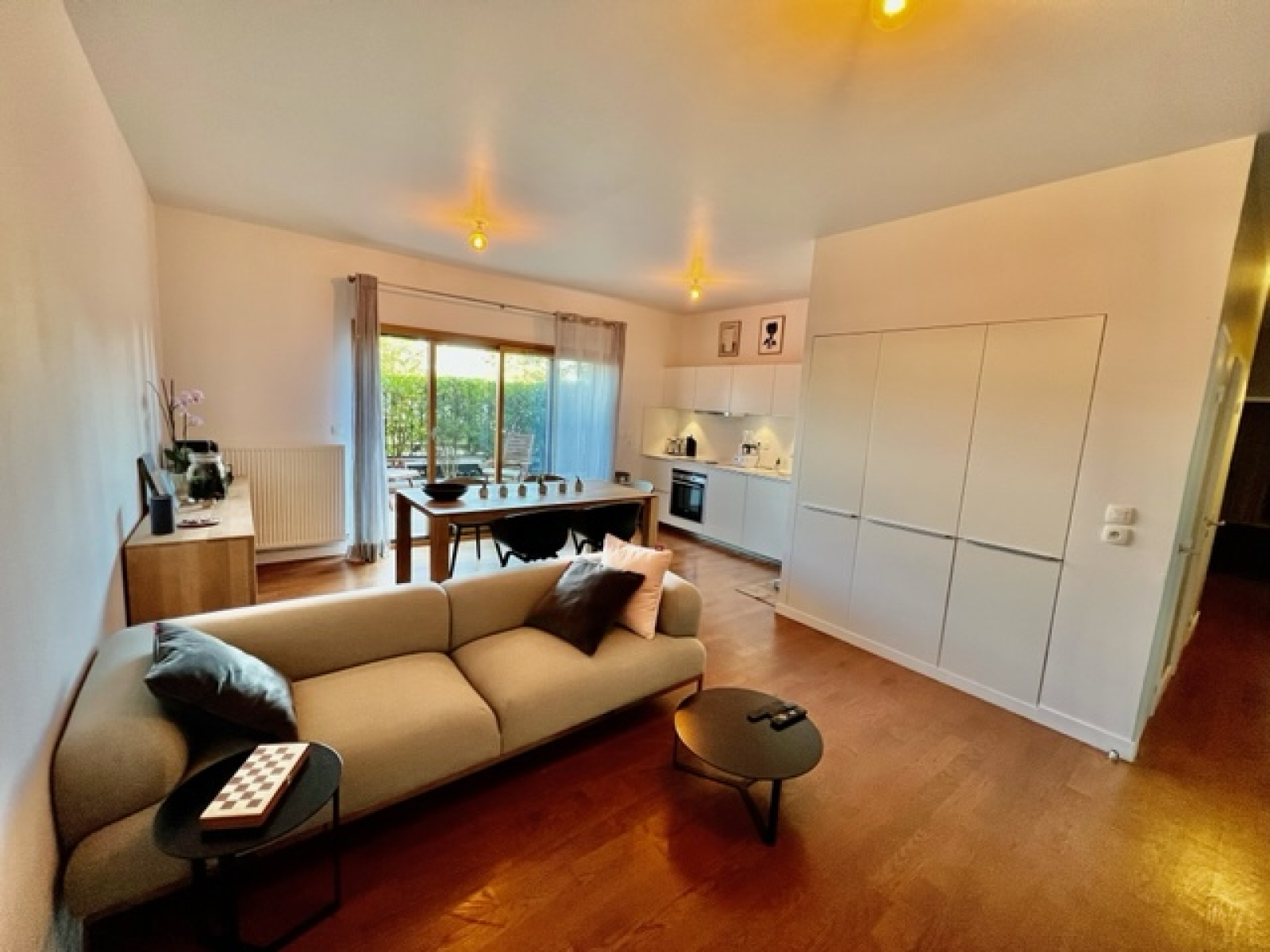 Exclusivité chez Matesa immobilier, dans résidence de grand standing et recherchée située au cœur de Divonne les Bains 01220, très bel appartement type T3 (2 chambres) de 68m² en rez de jardin privatif, et composé : Une pièce de vie ouverte avec salon séjour salle à manger et avec une très belle cuisine entièrement – le tout donnant accès à la terrasse et au jardin exposé plein sud, un dégagement, un wc suspendu séparé avec lave-main et espace buanderie, deux chambres avec placard, une salle de bain équipée, chauffage gaz de ville individuel, très belles prestations générales. En annexe : un grand garage box fermé en sous-sol. A VISITER RAPIDEMENT !