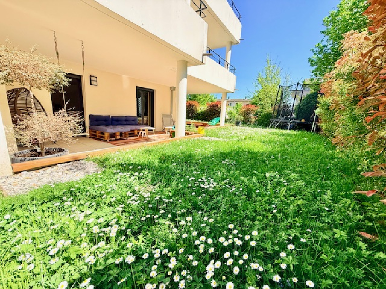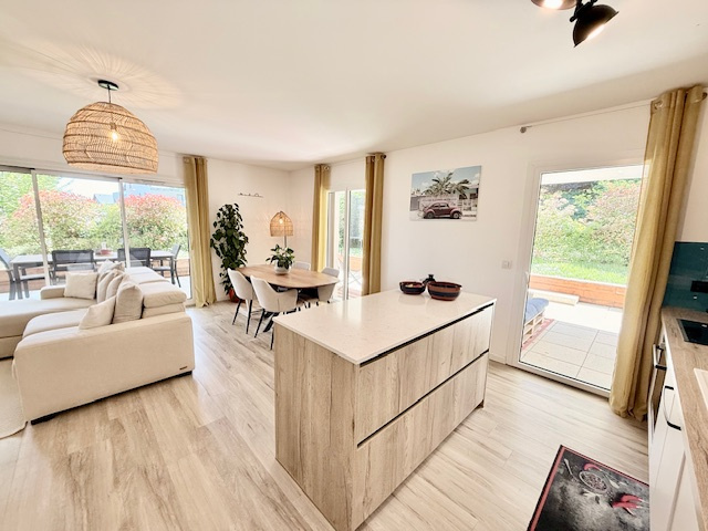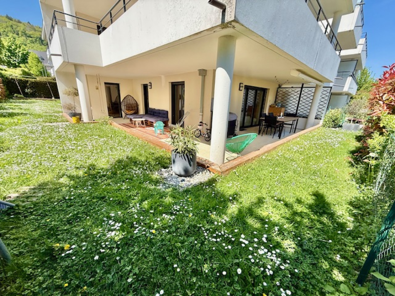 Divonne les Bains 01220, situé à deux pas du centre ville et de toutes les commodités ( commerces, bus, écoles), dans une résidence de standing sécurisée et clôturée avec un portail et bénéficiant de beaux espaces verts et d’une piscine privative, magnifique appartement type T4 ( 3 chambres) en angle sud-ouest, en parfait état, avec une très belle terrasse et un grand jardin privé sans vis-à-vis, et comprenant : une belle entrée avec un placard, lumineuse pièce de vie avec sa cuisine ouverte et entièrement équipée sur le salon-séjour-salle à manger, un dégagement, une buanderie, un wc suspendu séparé avec un lave-main, 3 chambres avec placards dont une suite parentale avec sa propre salle de douche à l’italienne et fenêtre, une autre salle de bain avec baignoire et wc.