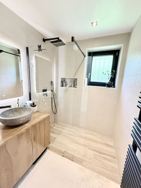En annexe : une grande cave aménagée, un garage double avec prise pour charger véhicule électrique et une place de parking privative.