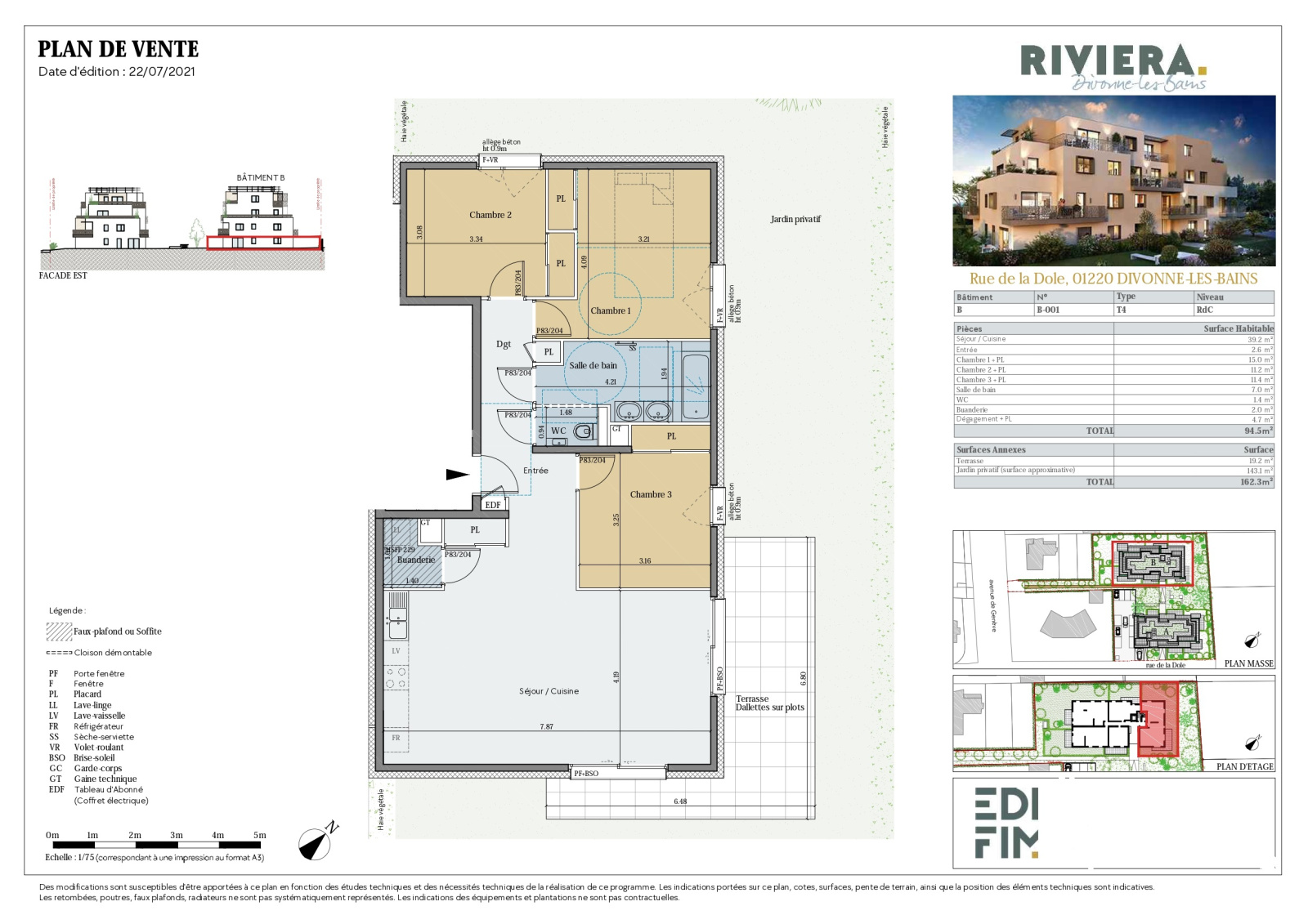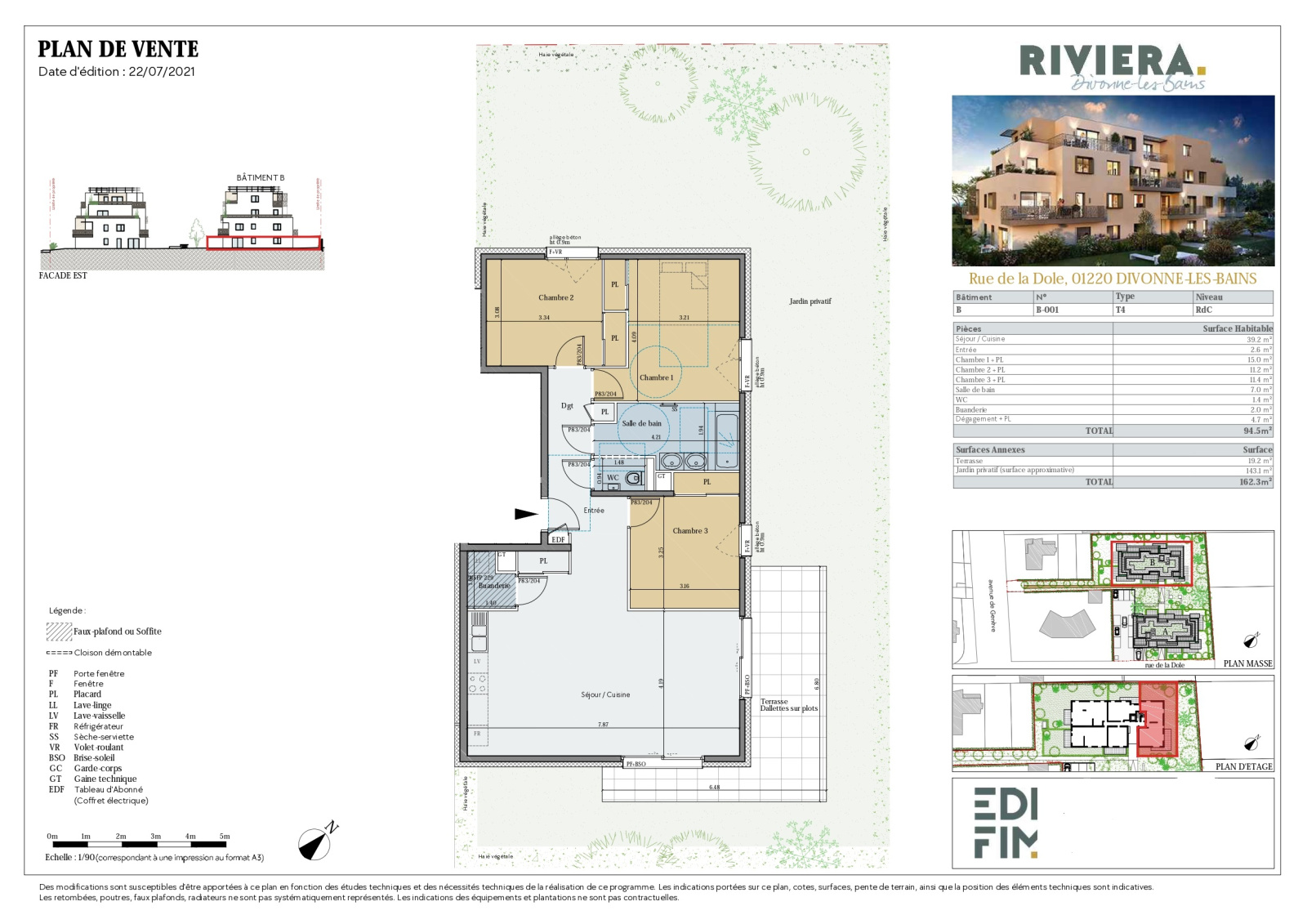 Divonne les Bains 01220, très bel Appartement de type 4 de 95m² traversant en rez de jardin privatif de 162m² et comporsée : d'une entrée avec placards, une buanderie, une pièce de vie avec cuisine ouverte sur le salon séjour salle à manger et donnant accès à la terrasse et au jardin; degagement avec un placard, 3 chambres avec placards, 1 salle de bains, 1 WC visiteur. En annexe : 2 garages fermés en sous-sol.