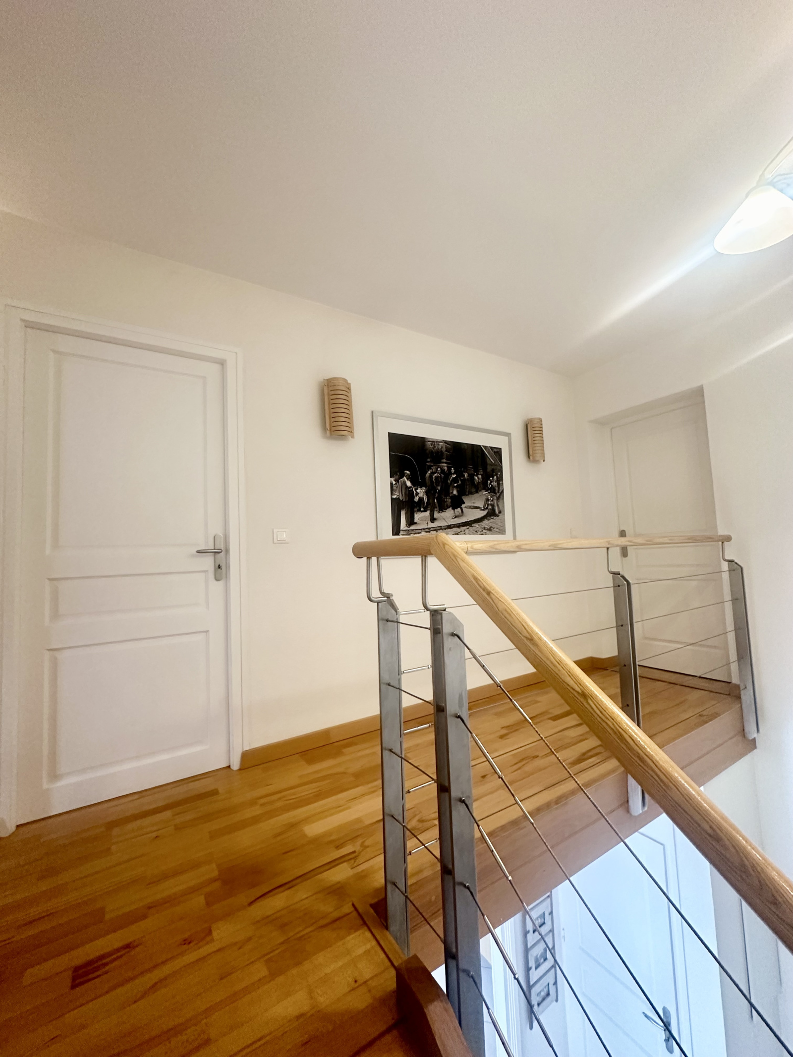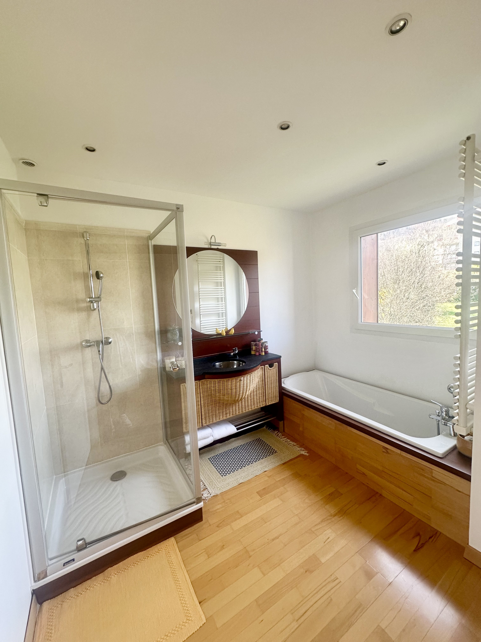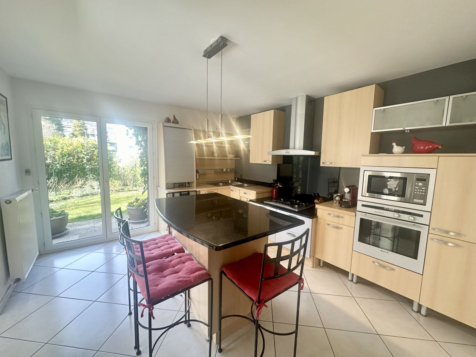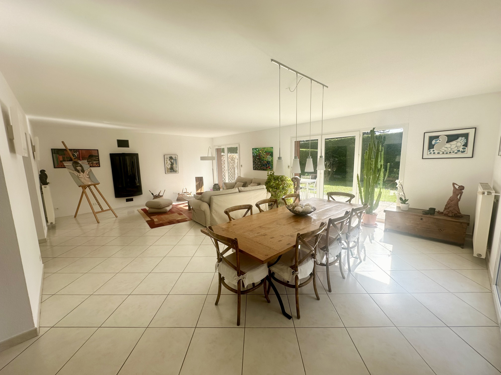 DIVONNE-LES-BAINS 01220 - Idéalement situé à deux pas du centre-ville et de toutes les commodités, au fond d’une impasse au calme, nous sommes ravis de vous présenter ce magnifique maison-appartement duplex de 188m2 habitables avec son jardin privatif exposé sud et ouest disposant de 4 grandes chambres et un grand double garage attenant. L’habitation est composée d'une agréable entrée, un WC invité avec un lave main, une cuisine entièrement équipée avec un accès au jardin, un vaste et lumineux salon séjour salle à manger avec un poêle à bois de belles baies vitrées donnant sur la terrasse et le jardin sans vis-à-vis. A l'étage : un dégagement desservant 4 chambres dont 2 avec placards intégrés, une salle de douche, un WC séparé, et dont une grande suite parentale avec sa propre salle de bain privative avec baignoire, douche et WC séparé, un deuxième grand salon-salle de TV - bureau, un dressing et un bureau. En annexe : un grand double garage avec espace buanderie. Ce bien dispose de nombreux avantages comme sa situation à deux pas du centre-ville, au pied de la voie verte et au fond d'une impasse très calme. Très faibles charges. Classement énergétique excellent. Chauffage gaz individuel, belles prestations générales. MATESA IMMOBILIER, agence immobilière Divonne les Bains 01220, vente et achat appartement et maison Divonne les Bains 01220 “Les informations sur les risques auxquels ce bien est exposé sont disponibles sur le site Géorisques http://www.georisques.gouv.fr”.
