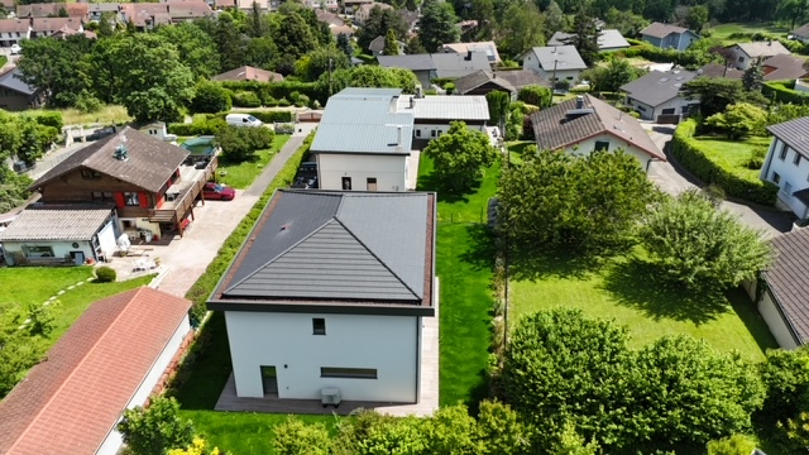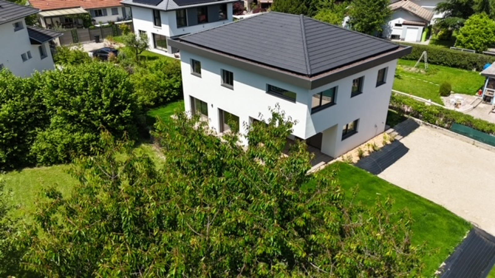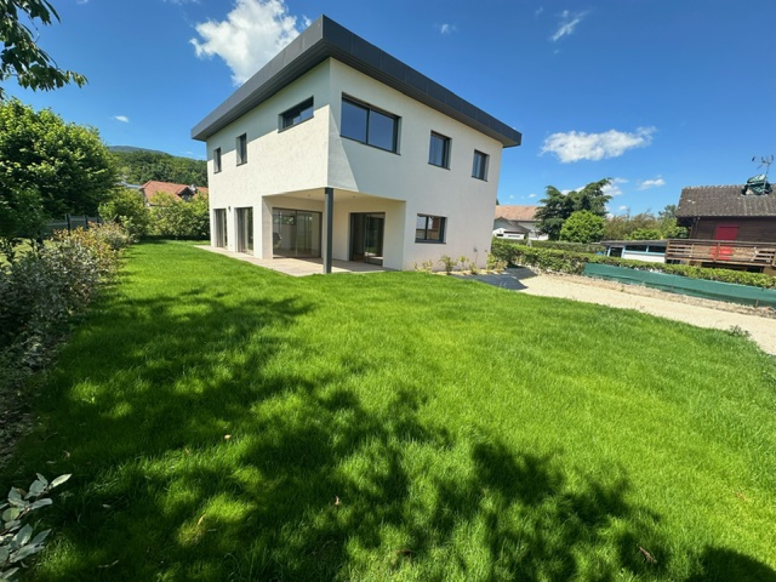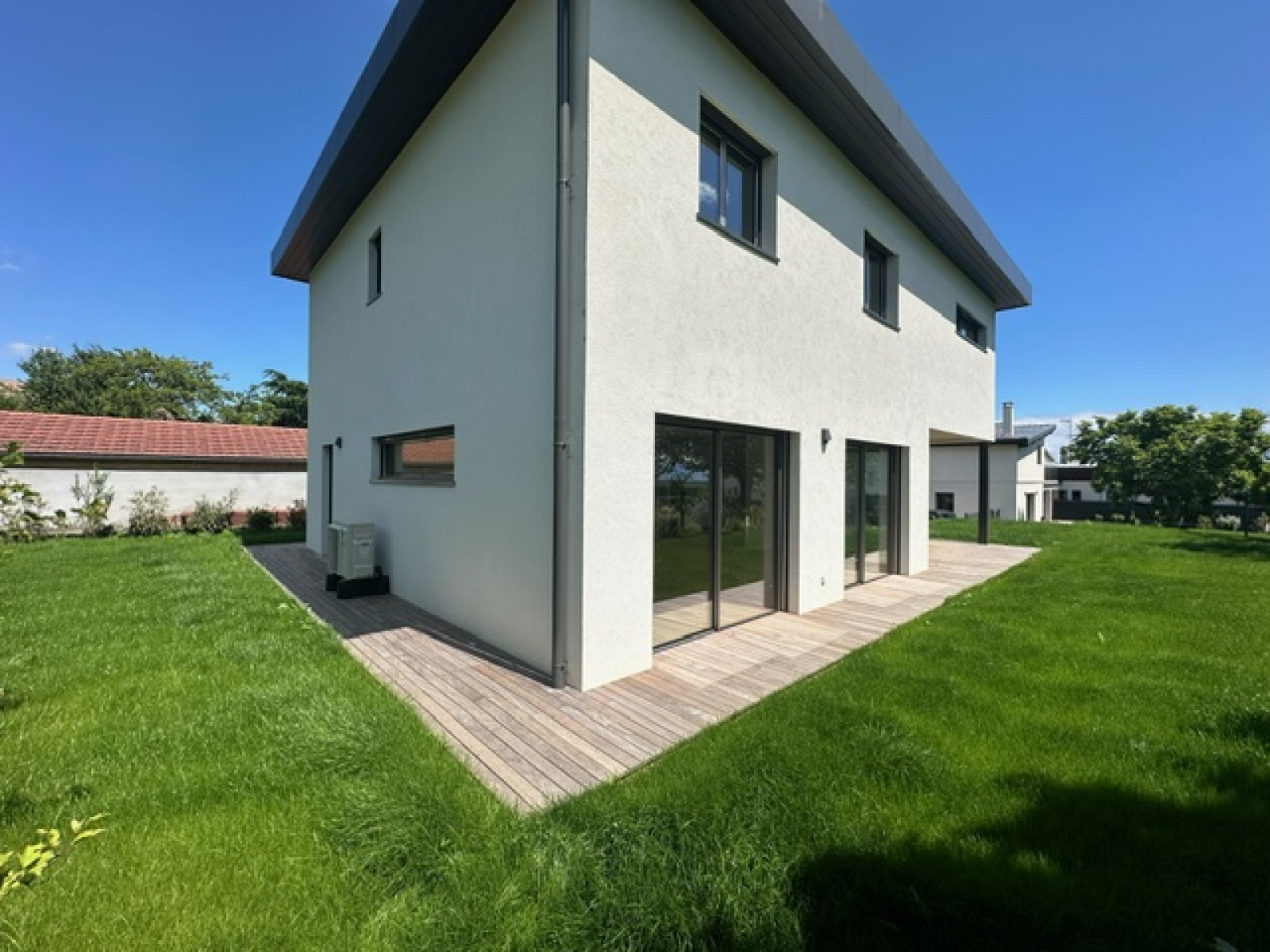 Divonne les Bains 01220, secteur Vesenex, au fond d’une impasse, nous vous proposons cette magnifique maison contemporaine très récente construite en 2024 avec des matériaux haut de gamme. Elle se developpe sur presque 200m² habitables avec 5 chambres dont 2 suites parentales, 3 WC, une arrière cuisine, une buanderie ainsi qu’une vaste pièce de pièce avec cuisine ouverte salon séjour salle à manger donnant directement sur la terrasse et le jardin, exposé sud et ouest. Maison très lumineuse et fonctioennelle. Normes écologiques (chauffage pompe à chaleur au sol). Elle bénéficie d’une vue sur le Lac L éman, l’environnement est calme et résidentiel. A VISITER RAPIDEMENT ! FNR (pas de garage)