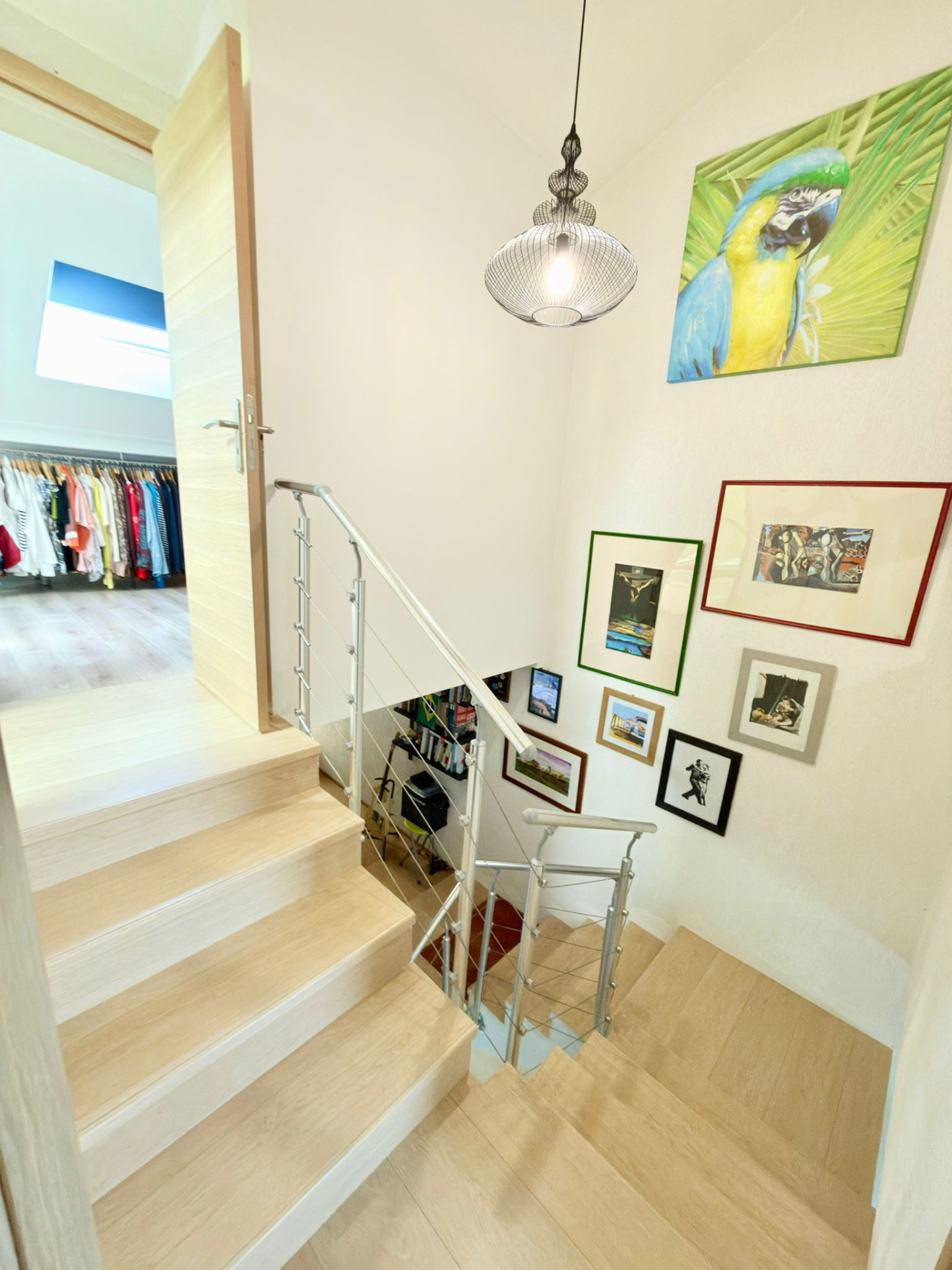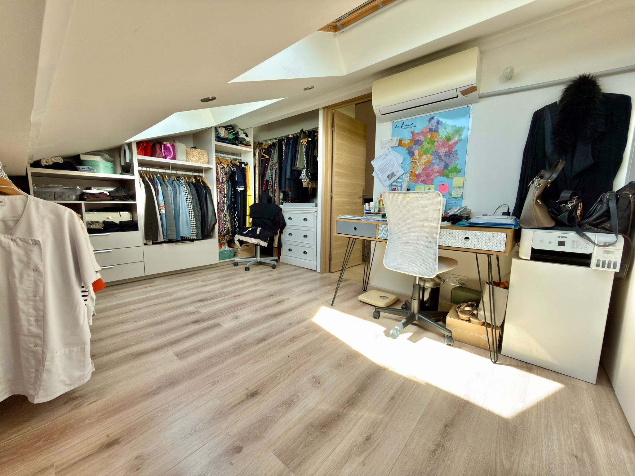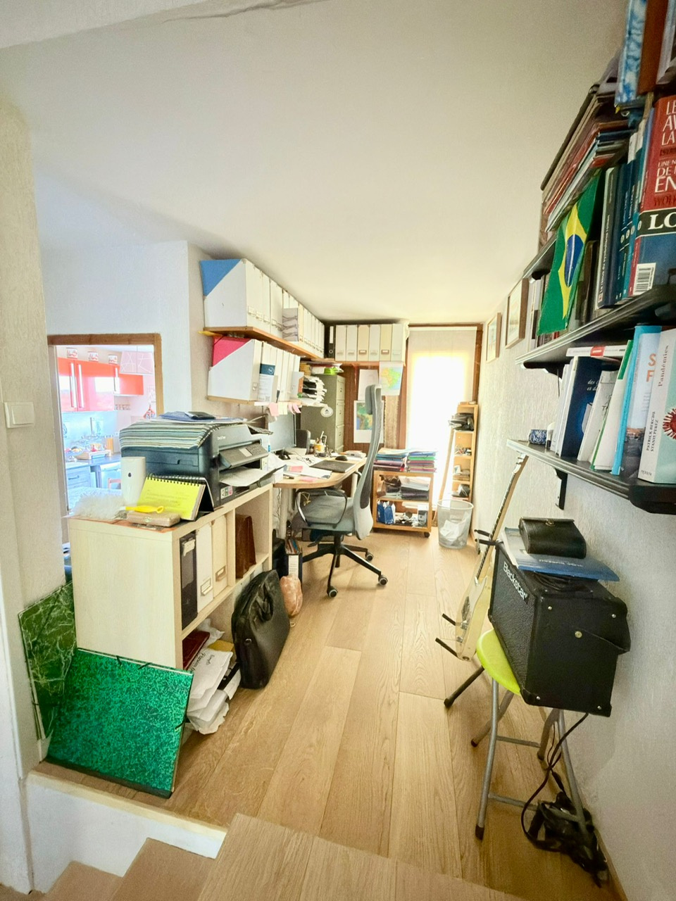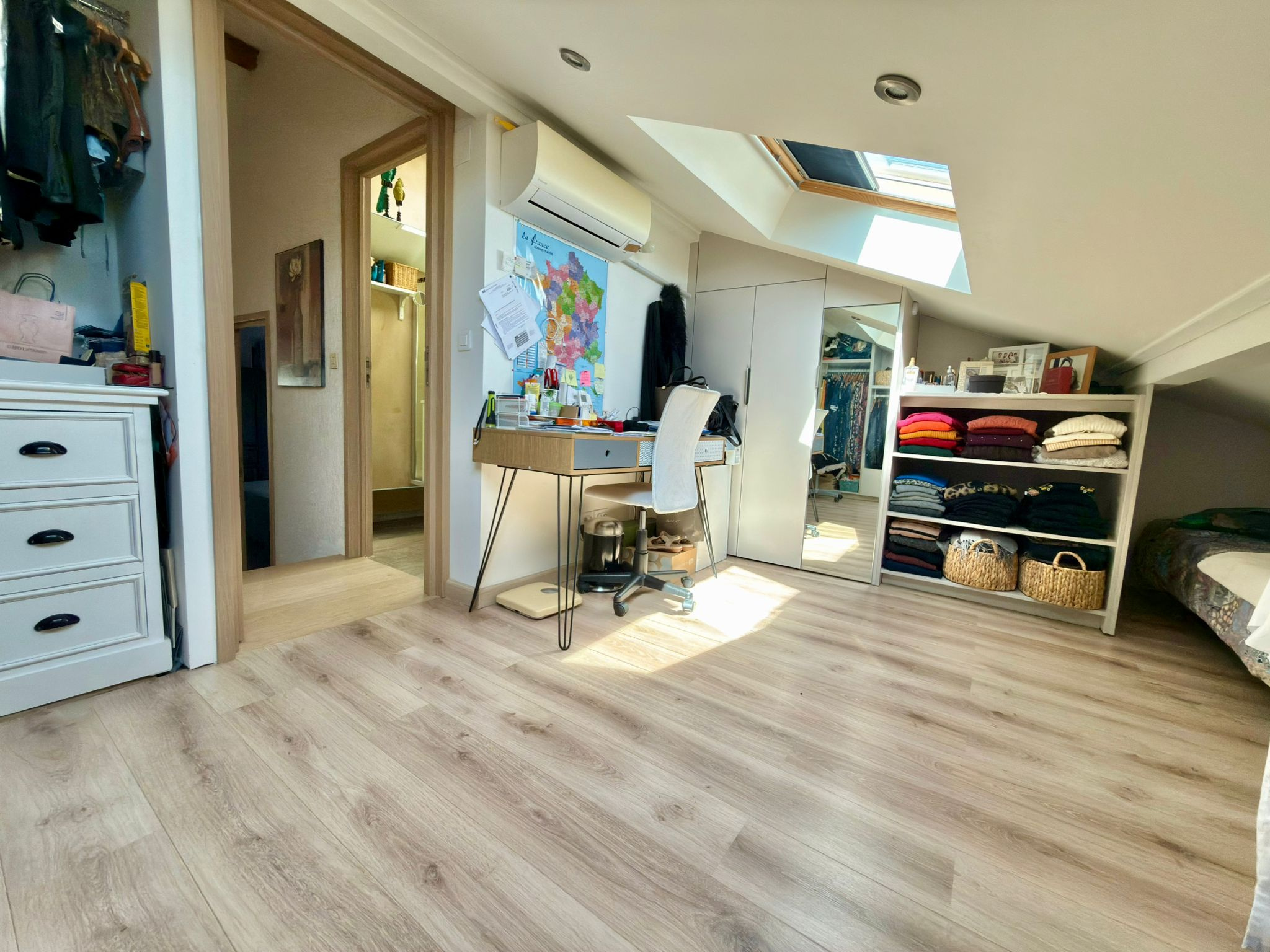 A l’étage : un coin bureau, 3 chambres dont une avec un balcon, une deuxième salle douche avec un wc.