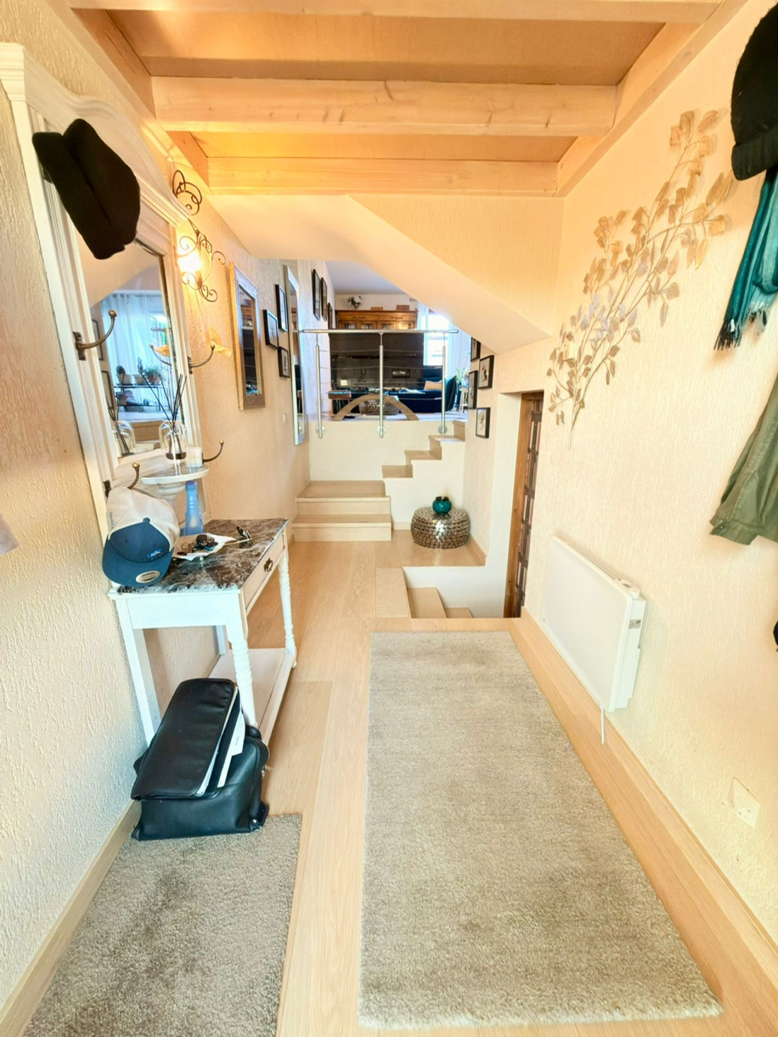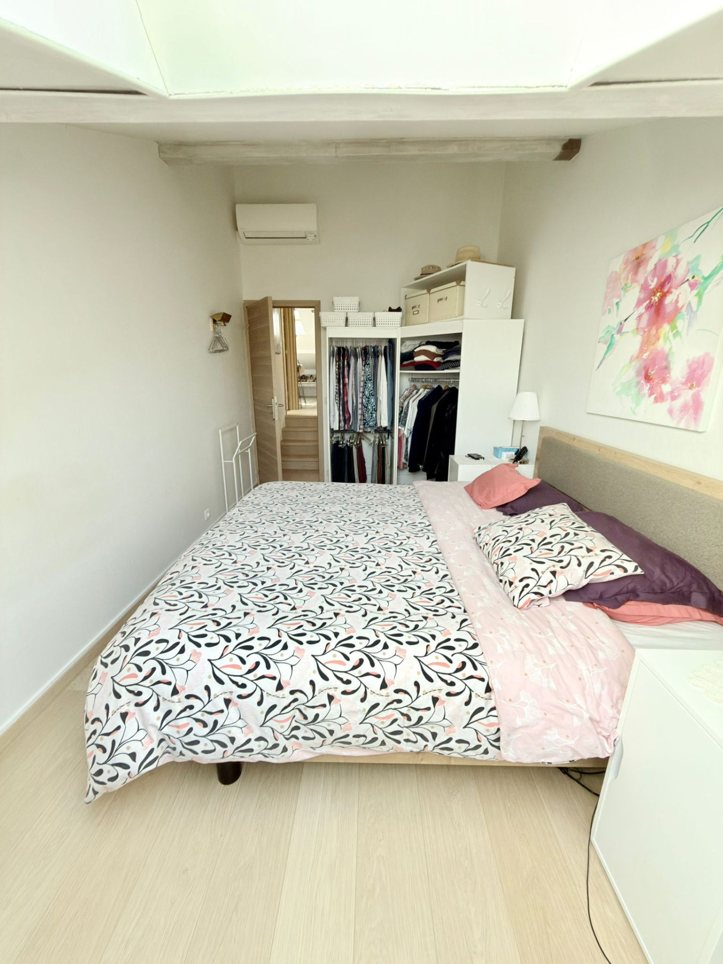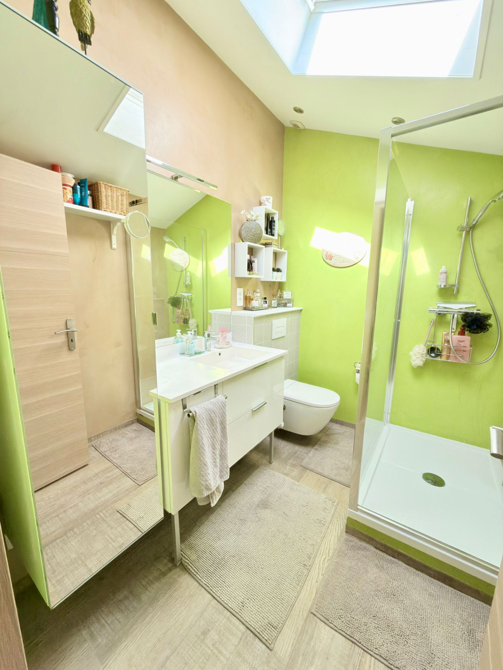 A l’étage : un coin bureau, 3 chambres dont une avec un balcon, une deuxième salle douche avec un wc.