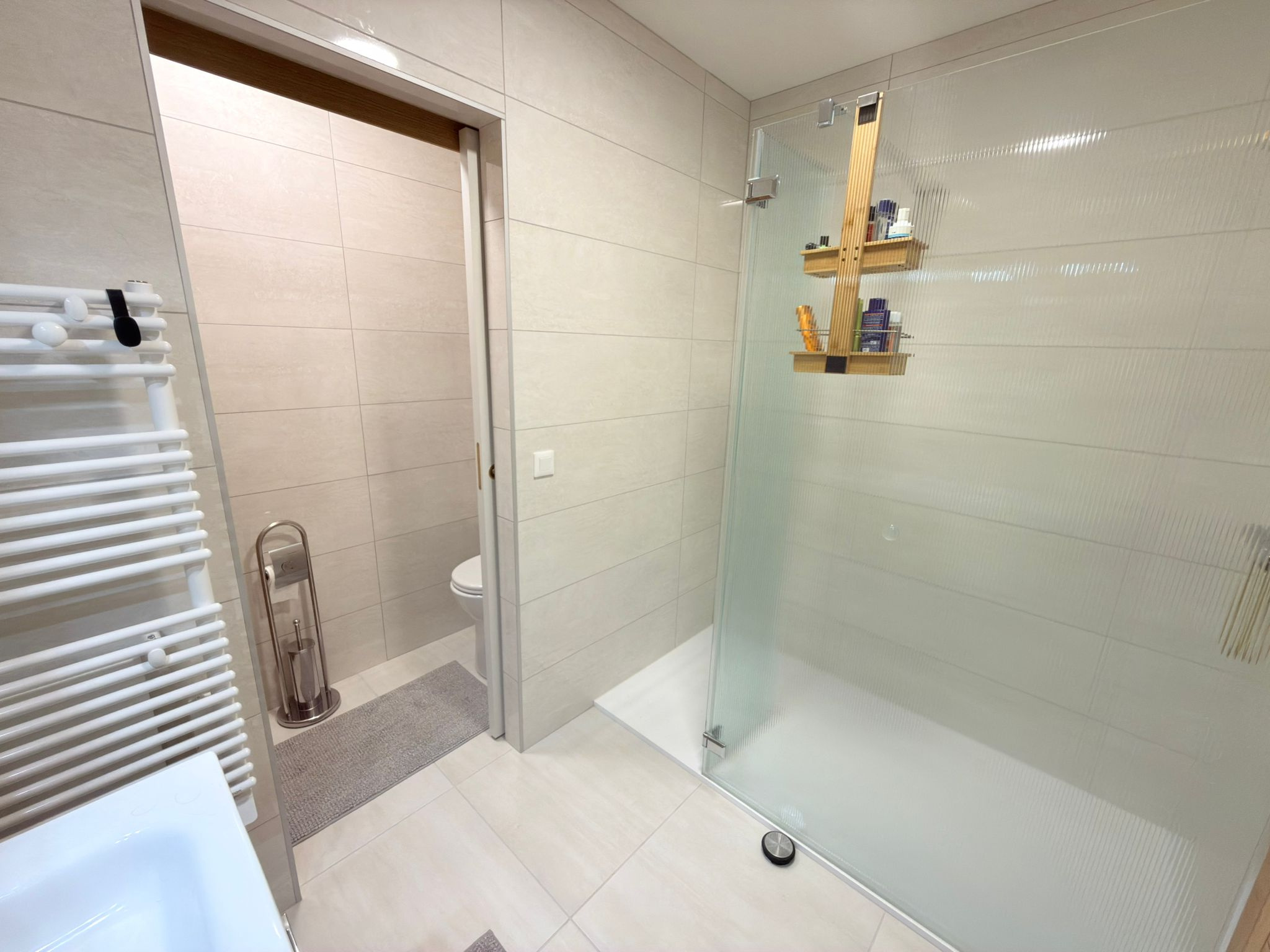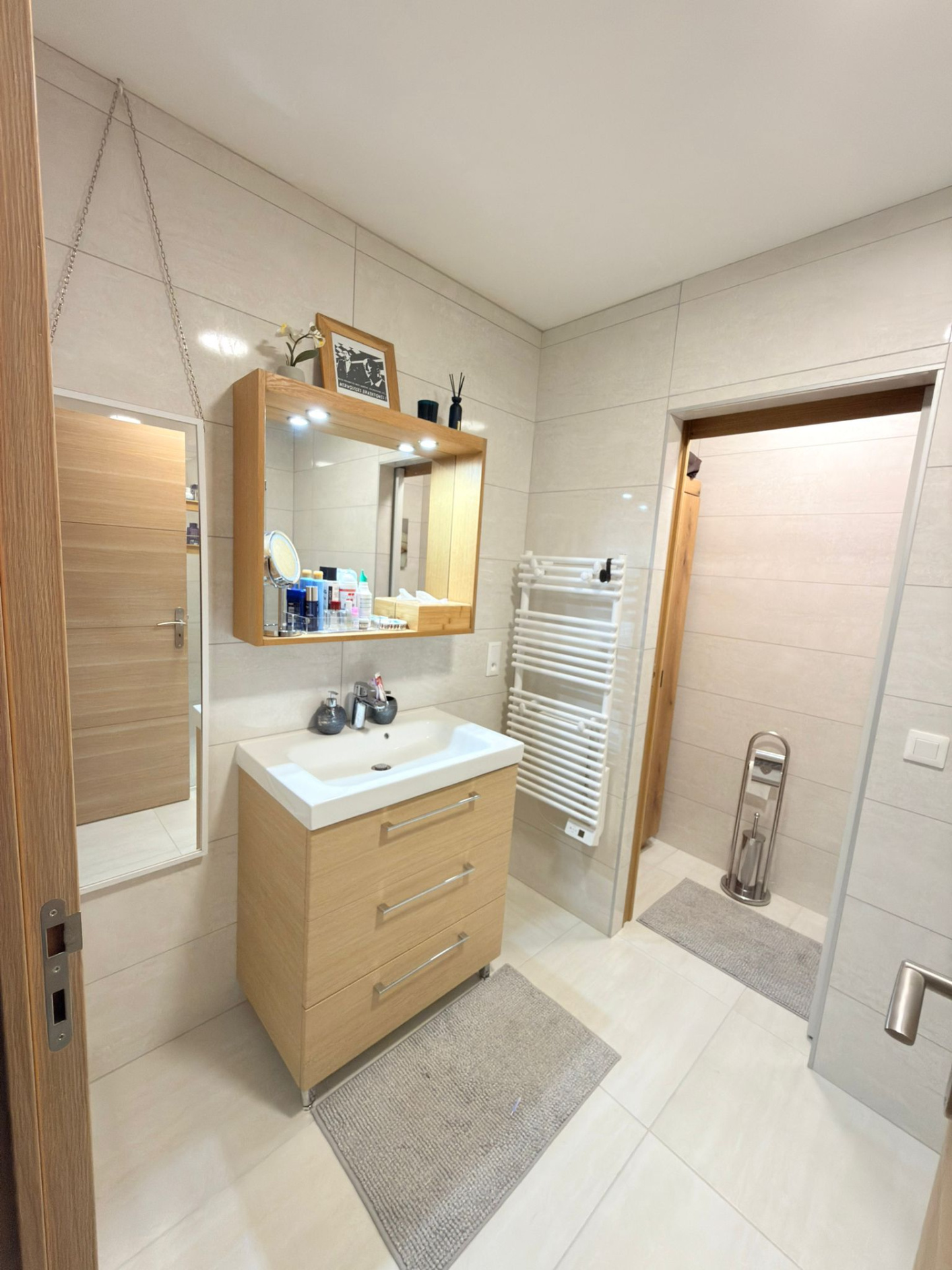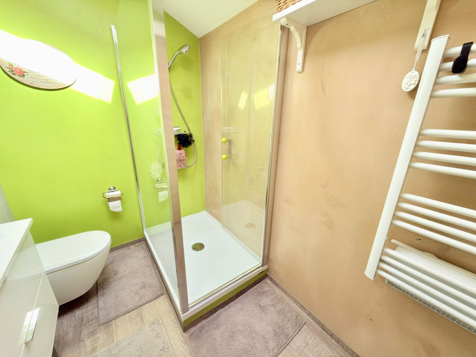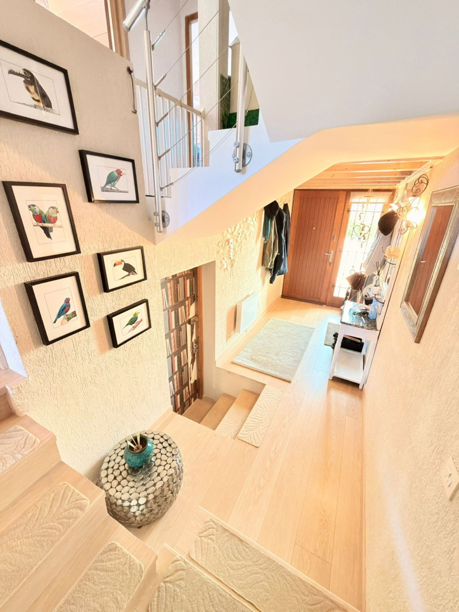 A l’étage : un coin bureau, 3 chambres dont une avec un balcon, une deuxième salle douche avec un wc.