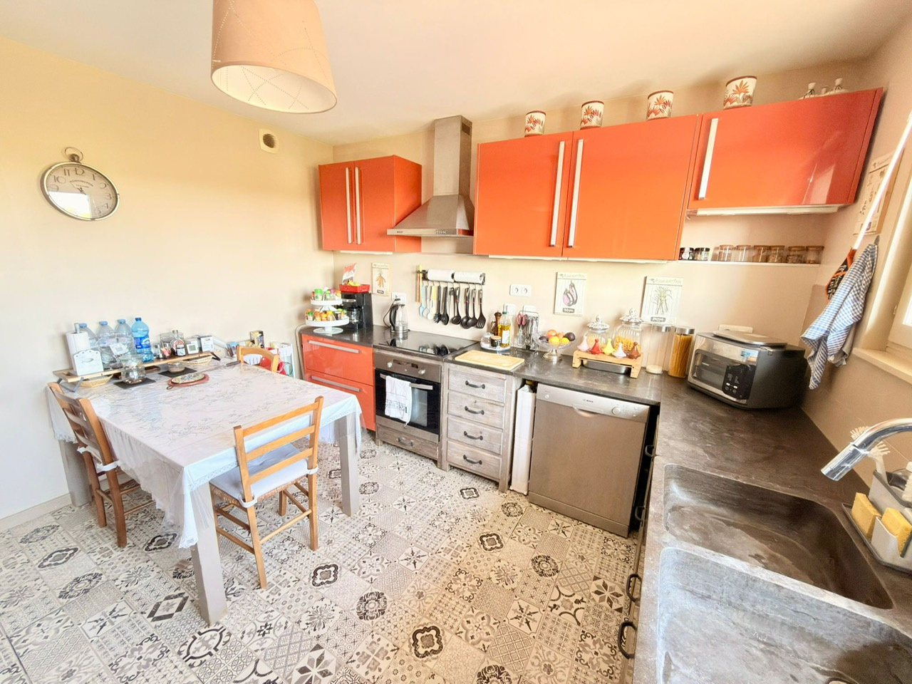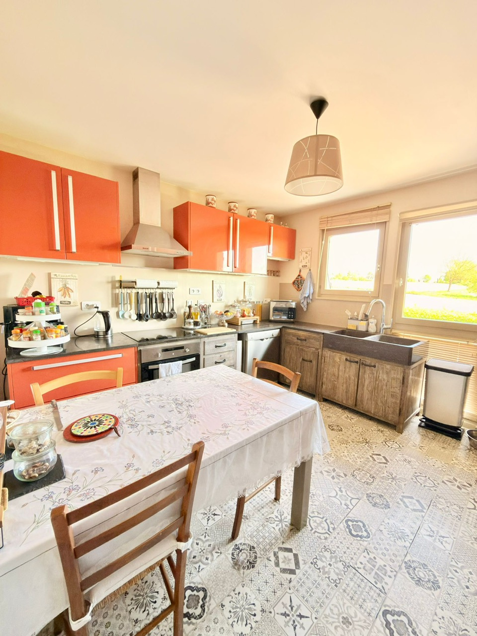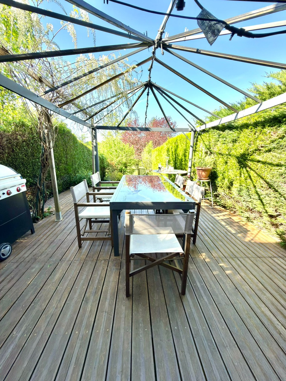 Elle est composée au rez-de-chaussée d’une belle entrée accueillante, d’une cuisine entièrement équipée indépendante avec un espace repas, un agréable salon-séjour avec une cheminée et donnant accès directement à la terrasse en bois avec une pergola ainsi qu’au jardin exposé plein sud et ouest, une salle de douche avec wc entièrement rénovée.