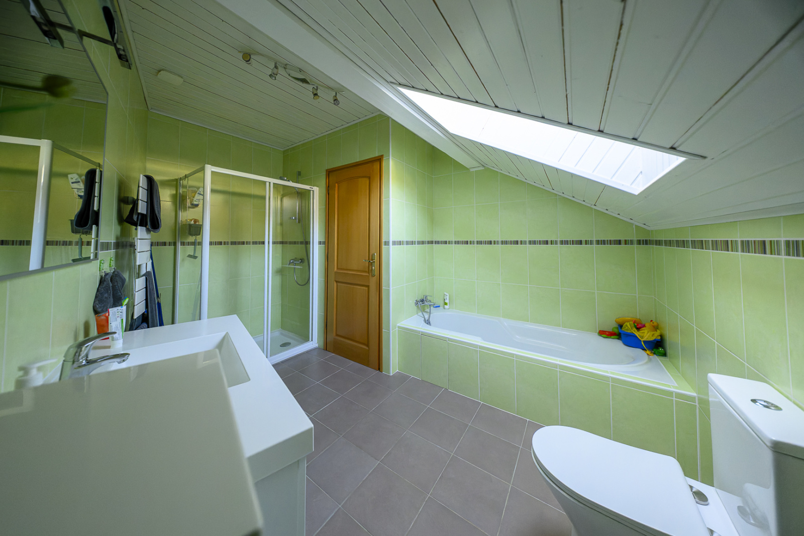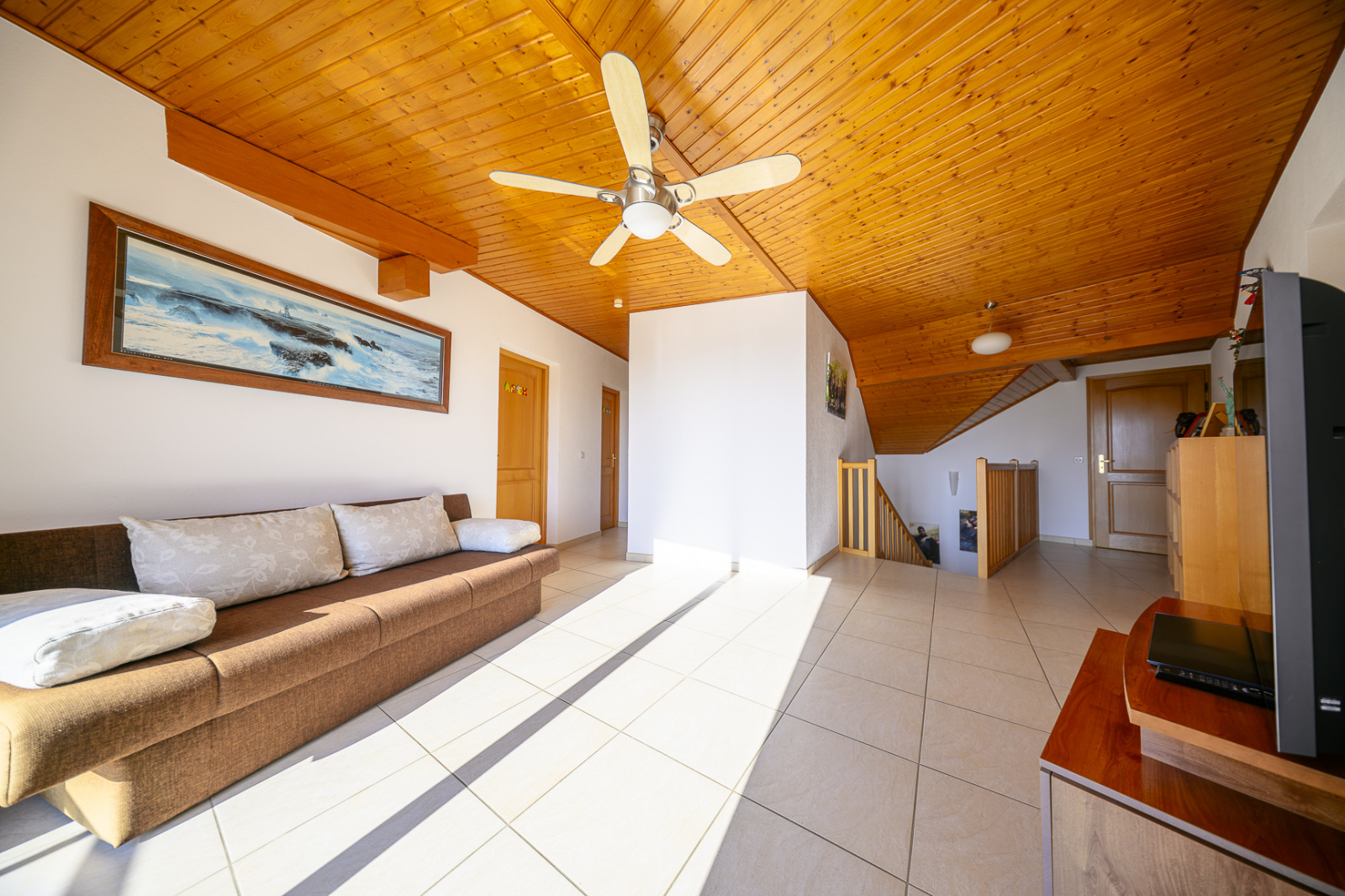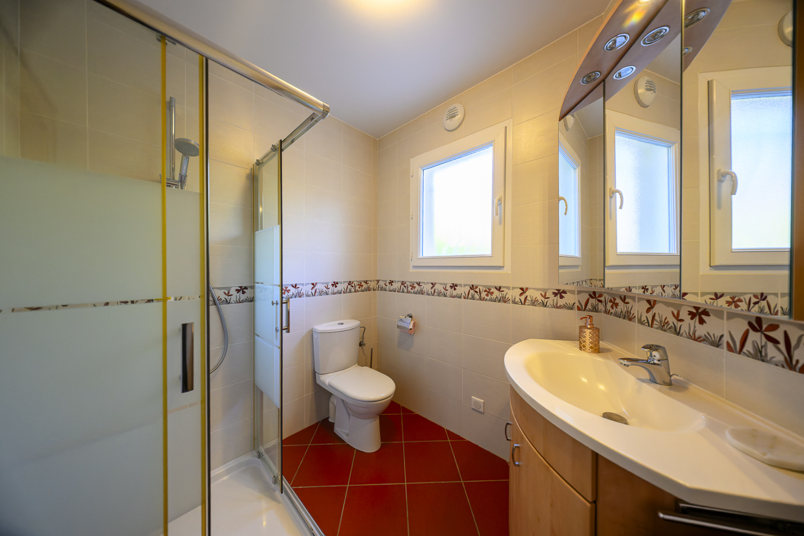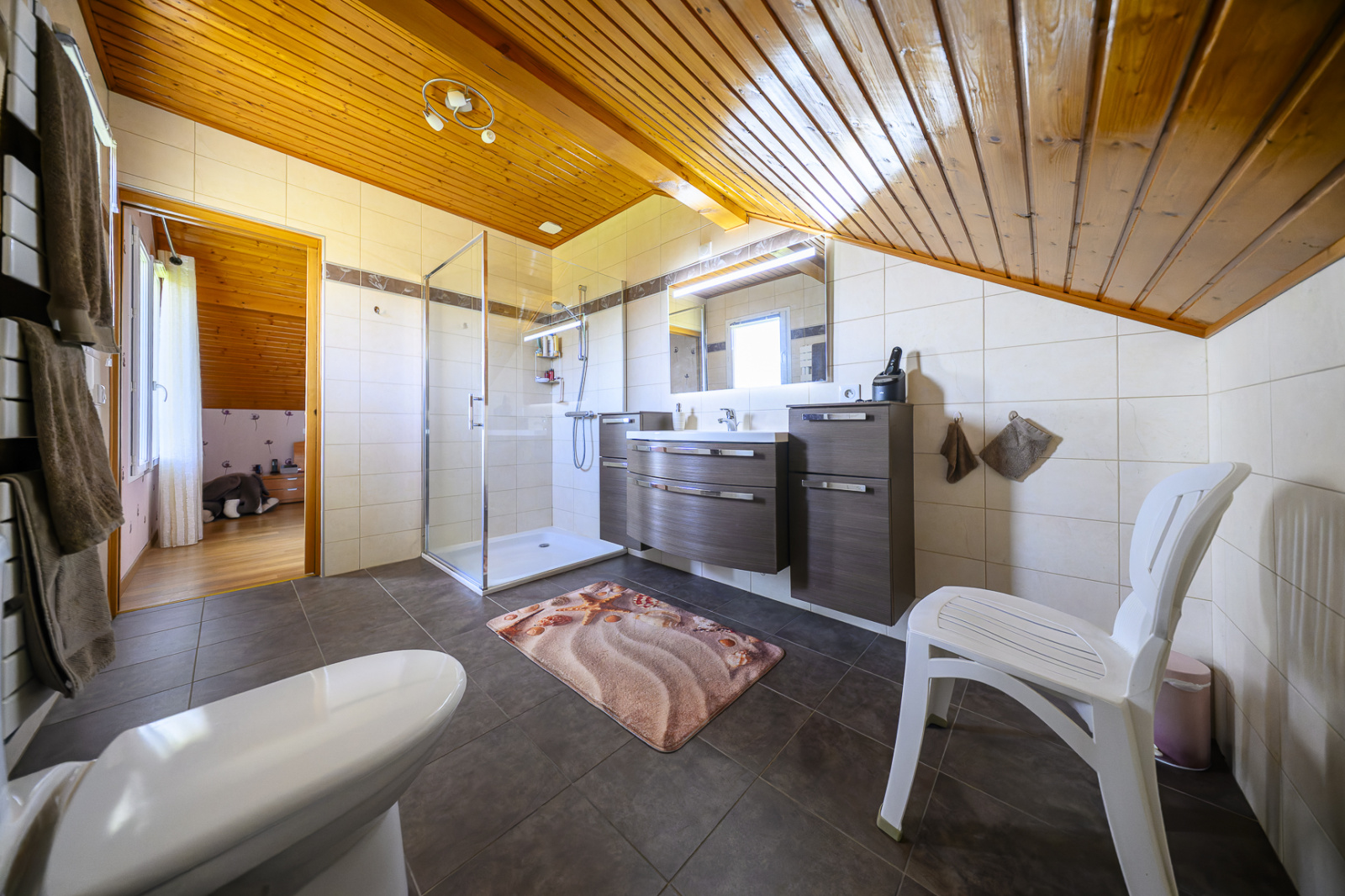 A l’étage : un grand espace tv – mezzanine avec balcon et vue panoramique, 4 grandes chambres dont une suite parentale avec son dressing et sa salle de douche avec un wc, une autre salle de bain familiale avec baignoire et wc.
